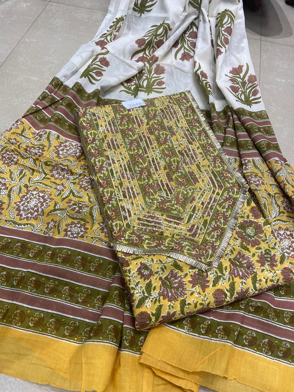 Pure Cotton desigenr block print shirt with gotta work ,Pure cotton Dupatta block print, pure cotton block print bottom.