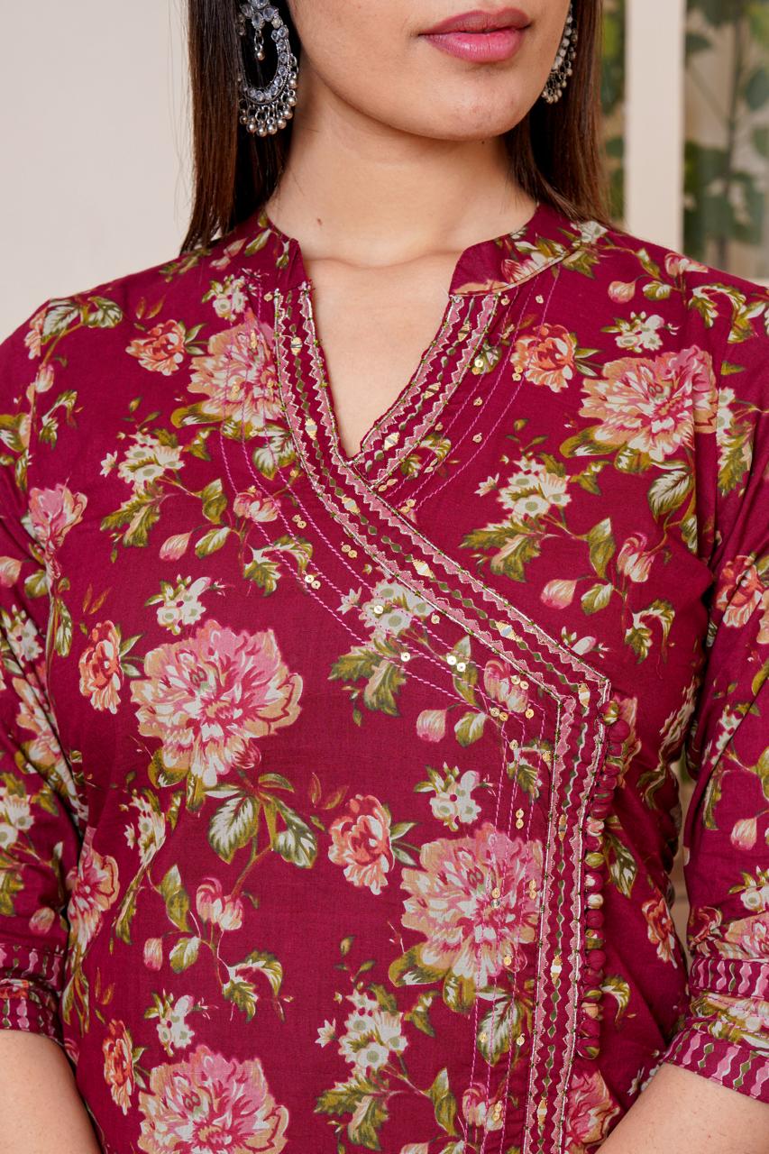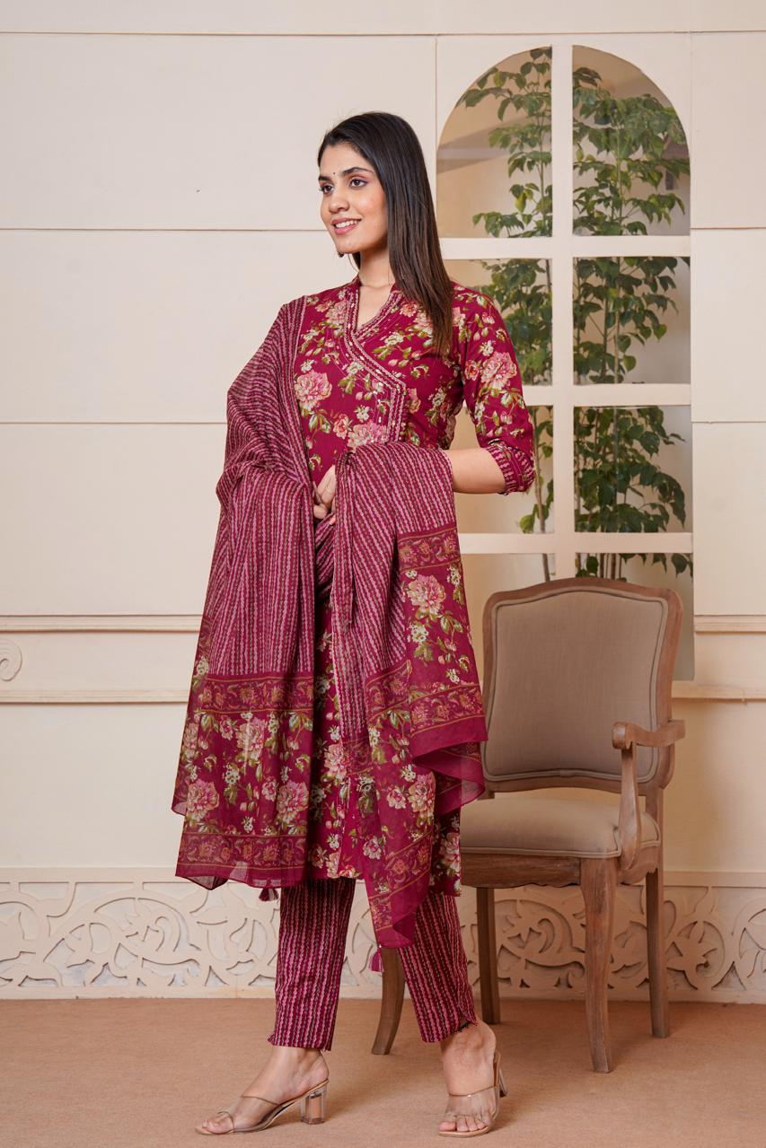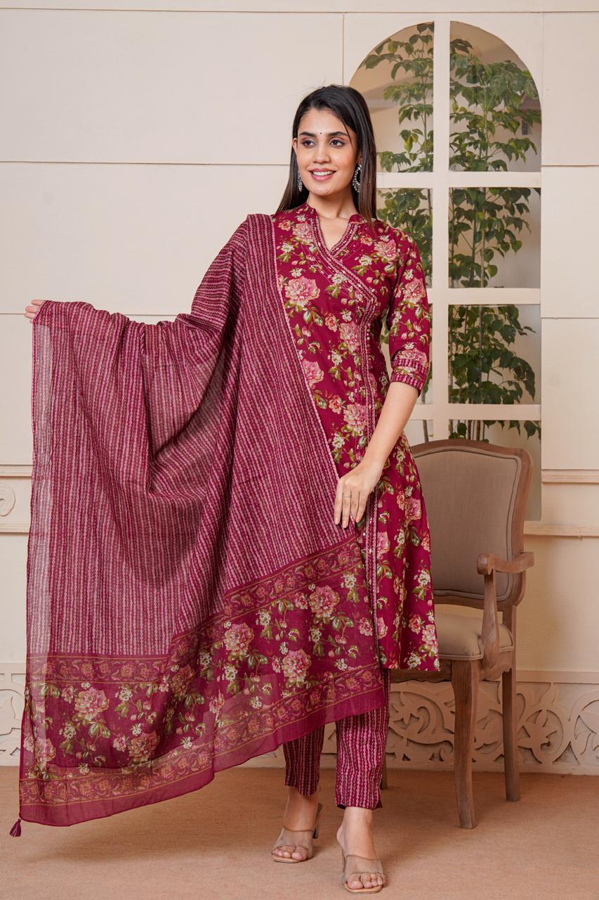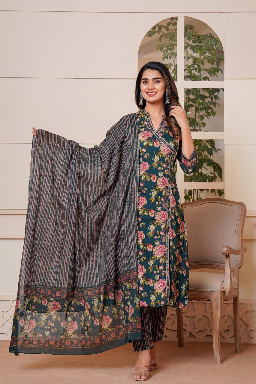 **Beautiful Fully Stitched Angrakha A- line Pure Cotton Shirts With Sequence Highlighting,Pure Cotton Stitched Bottoms,Beautiful Pure Cotton Dupattas With Gota Detailings*