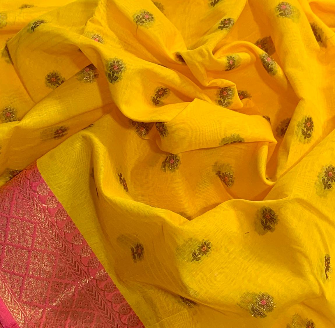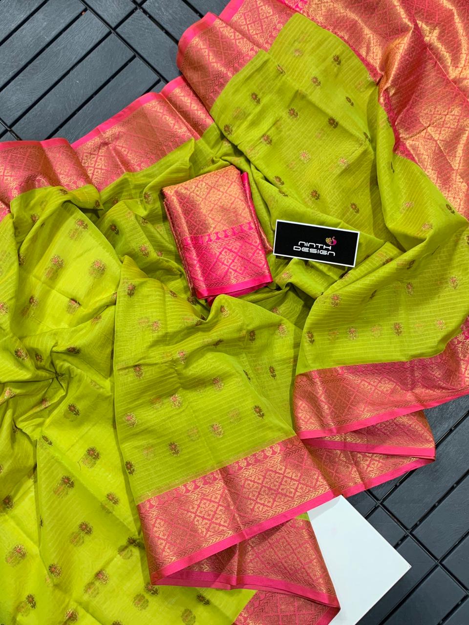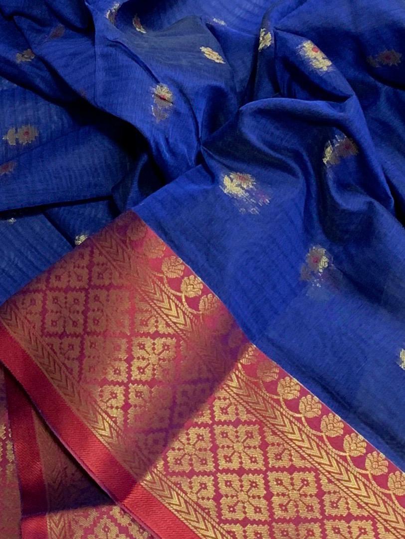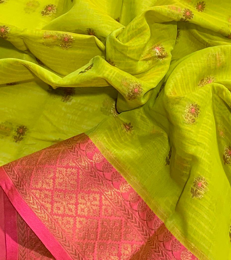 Discover Latest Designs of Chanderi Lakshadweep Pattern with Contrast Weaving Border,Contrast Rich Pallu, Contrast Brocade Blouse.