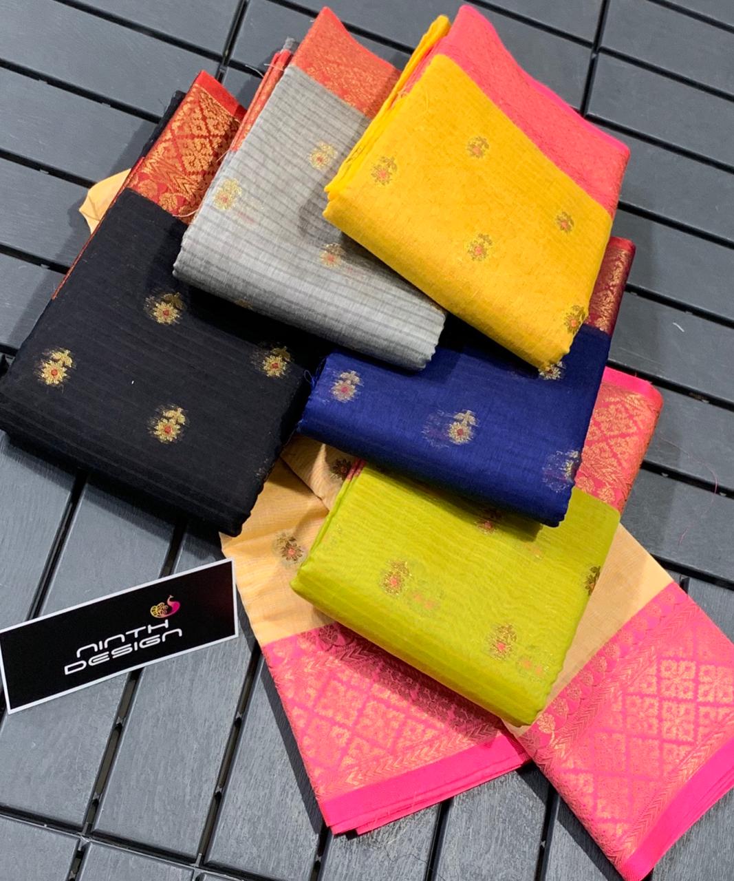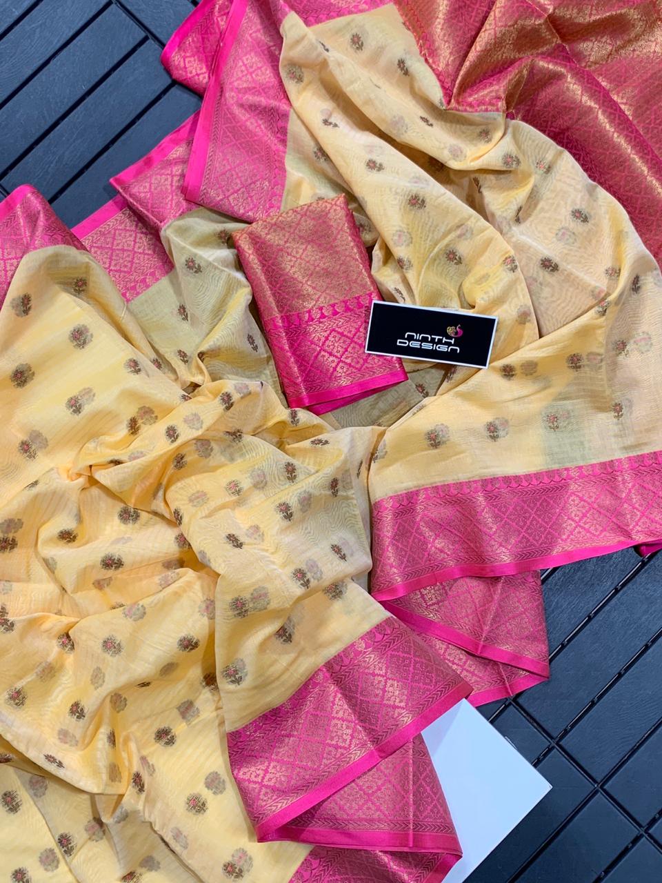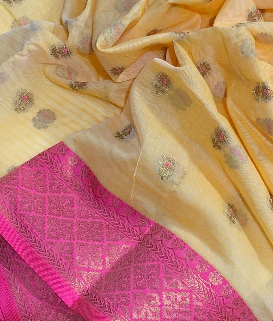 Discover Latest Designs of Chanderi Lakshadweep Pattern with Contrast Weaving Border,Contrast Rich Pallu, Contrast Brocade Blouse.