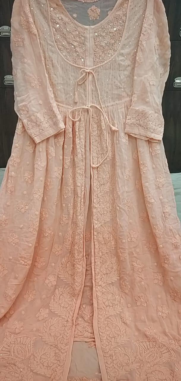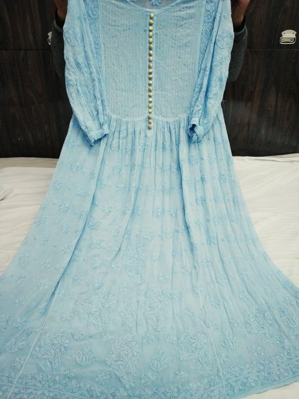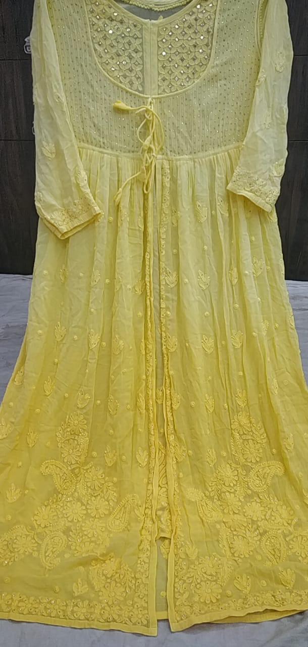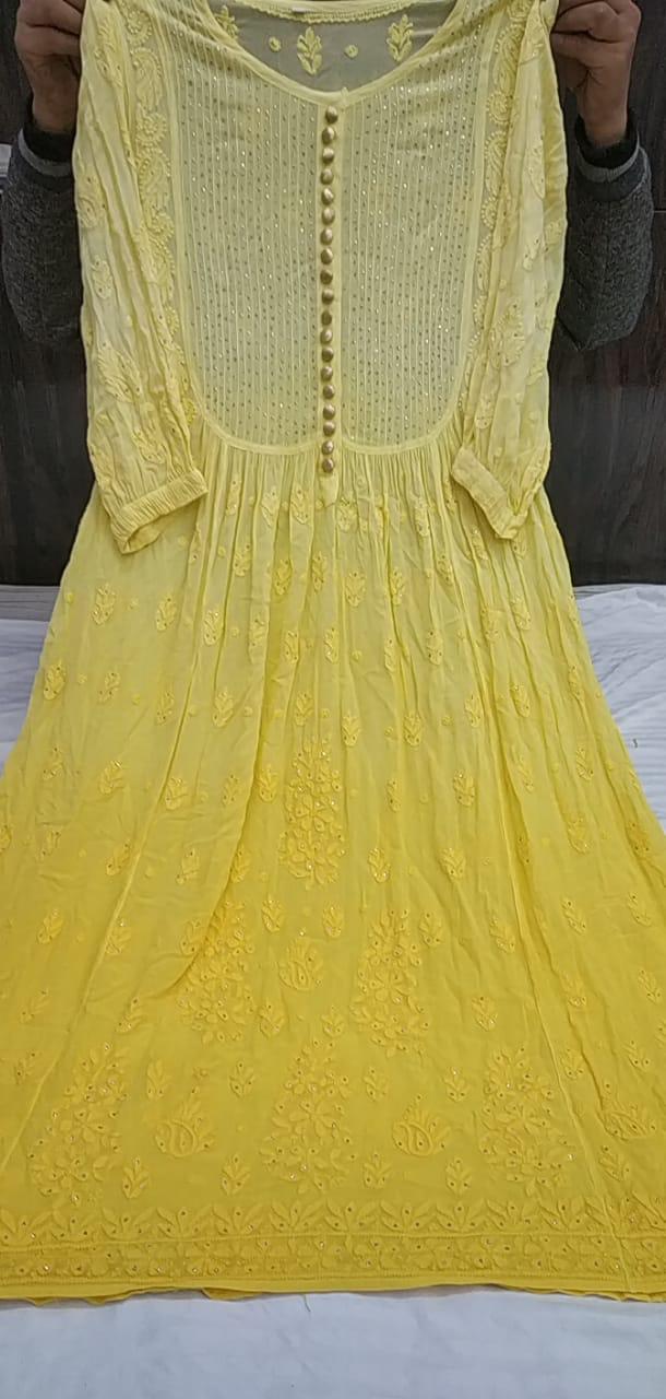 Pure viscose georgette full dyeable best of chikankari handwork lucknowi gowns with mukaish work,Sizes 38 to 46 available.
