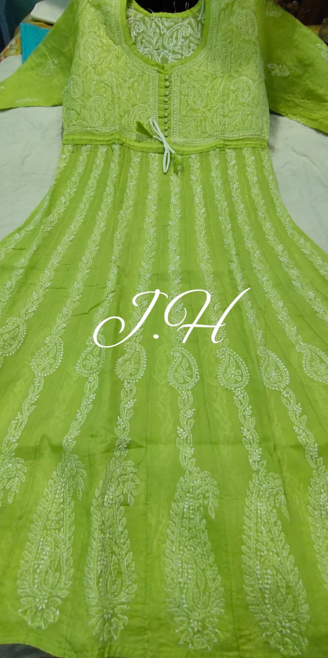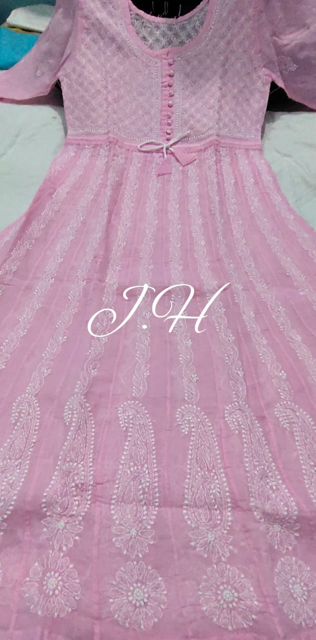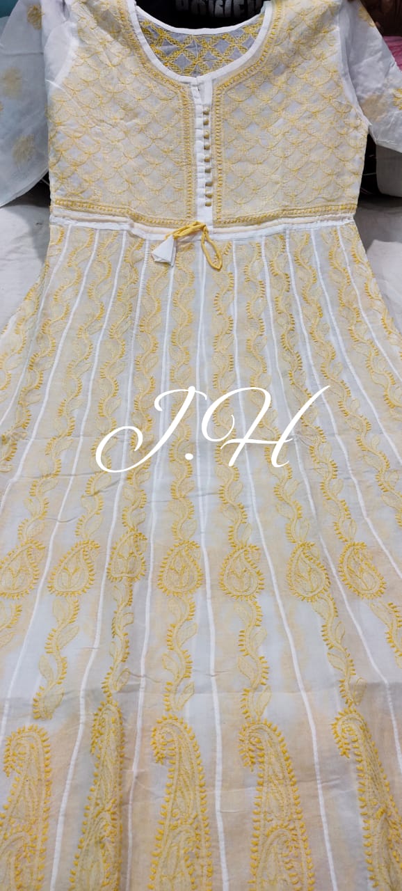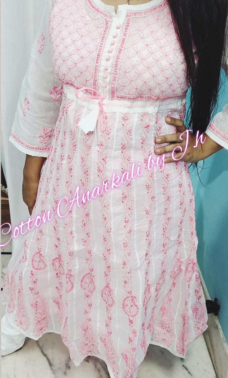 Very Beautiful Chikankari Cotton Anarkali with Dori For Adjust, FRONT and BACK same, Size available 38 to 46,Length 50 Approx.