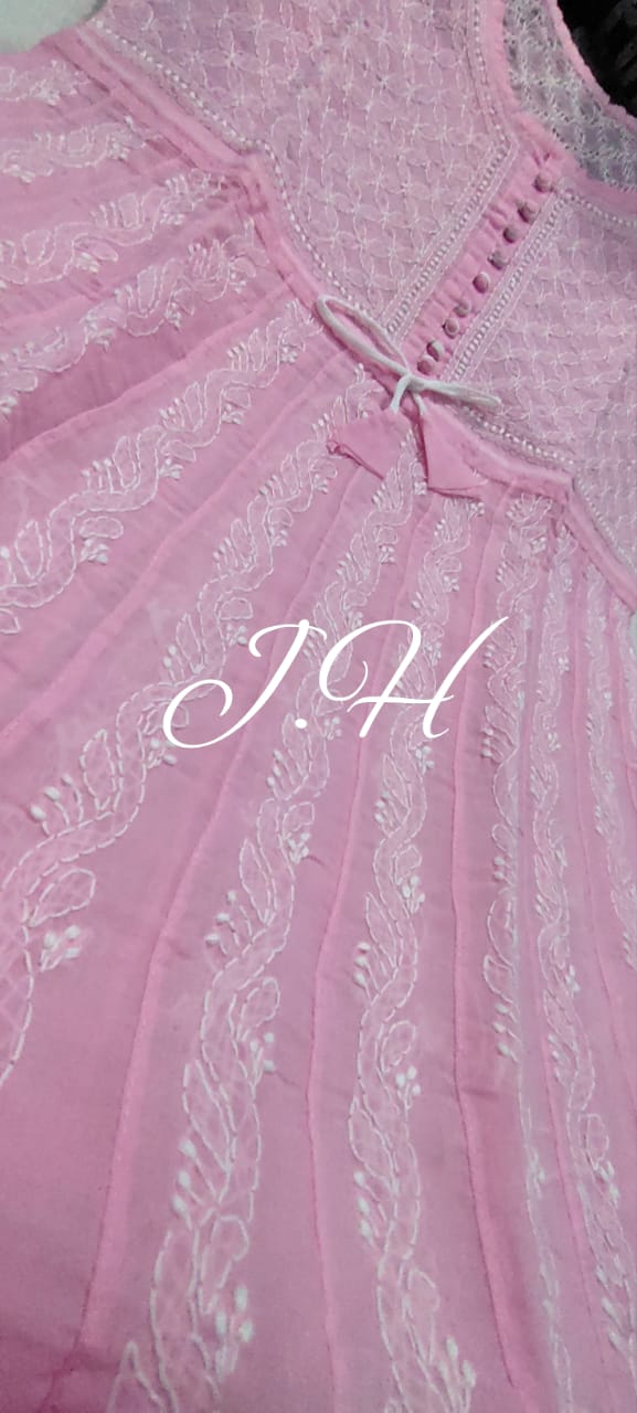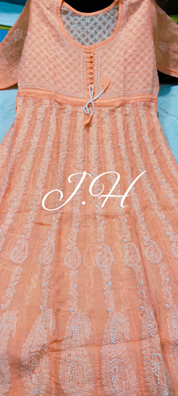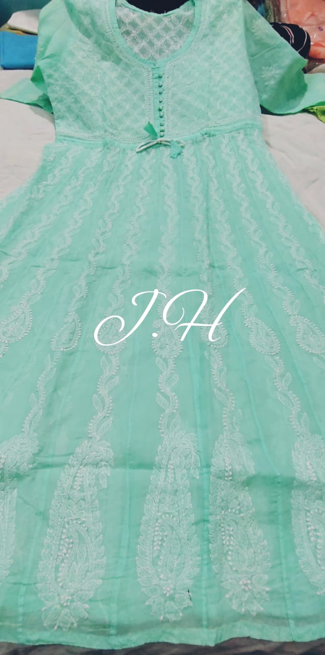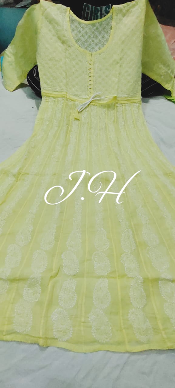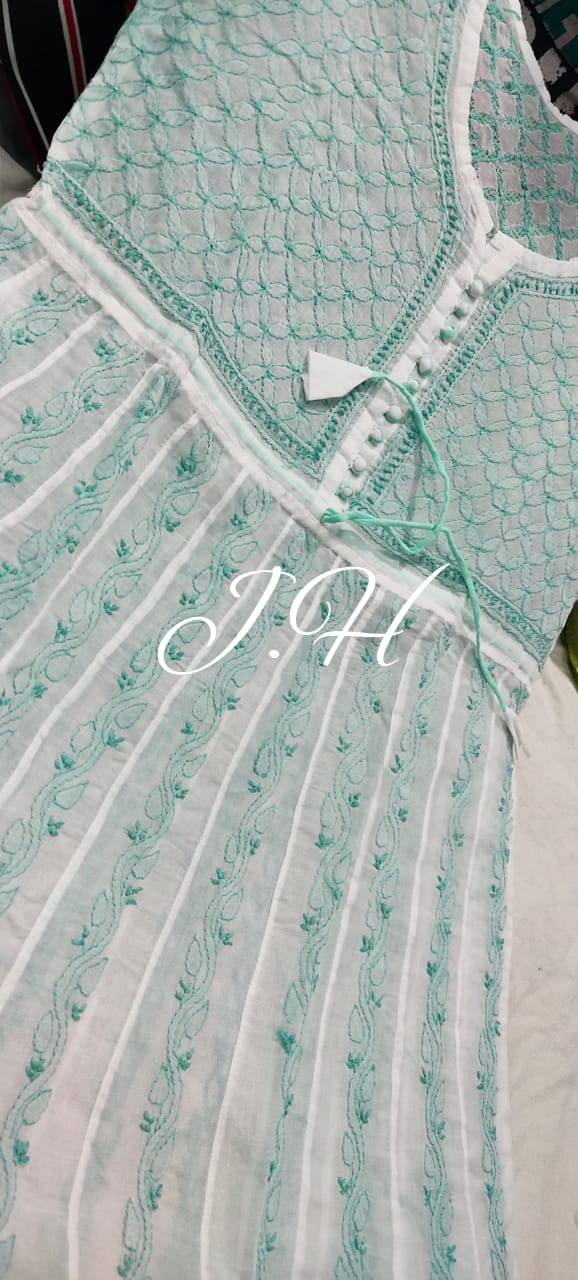 Very Beautiful Chikankari Cotton Anarkali with Dori For Adjust, FRONT and BACK same, Size available 38 to 46,Length 50 Approx.