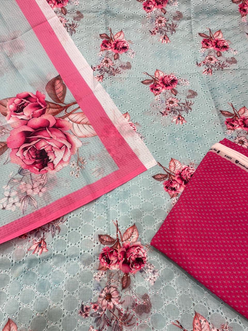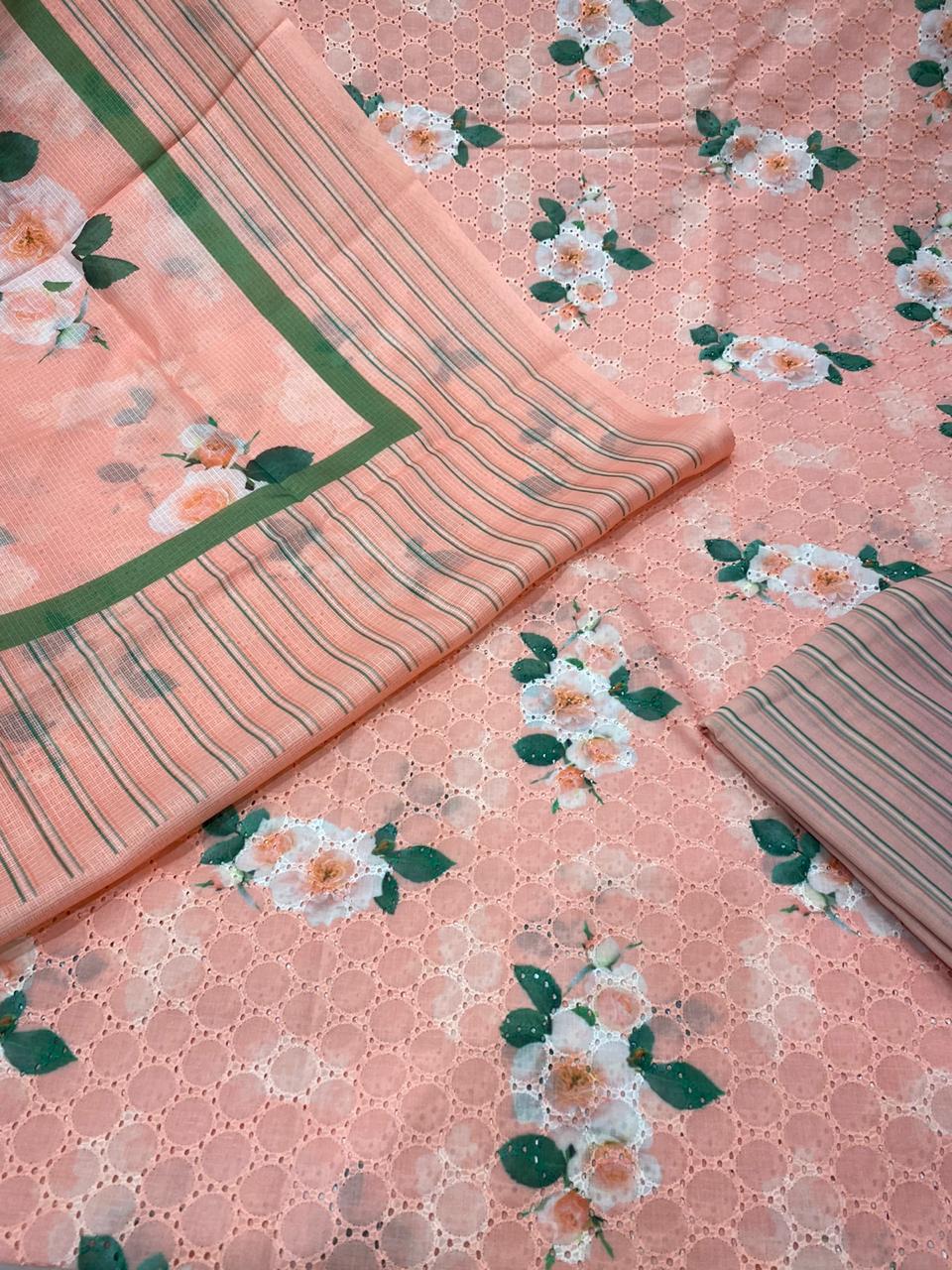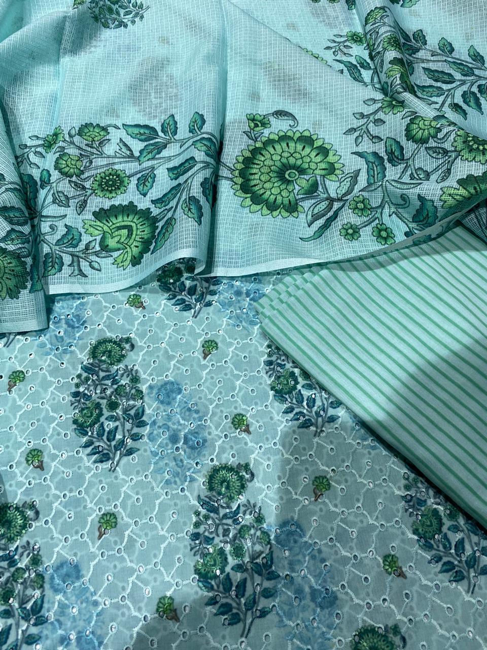 Cotton chicken Embroidey with digital print shirtteam up with 2 by 2 cotton stripes bottom 3 meter Kota Doria digital printed dupatta