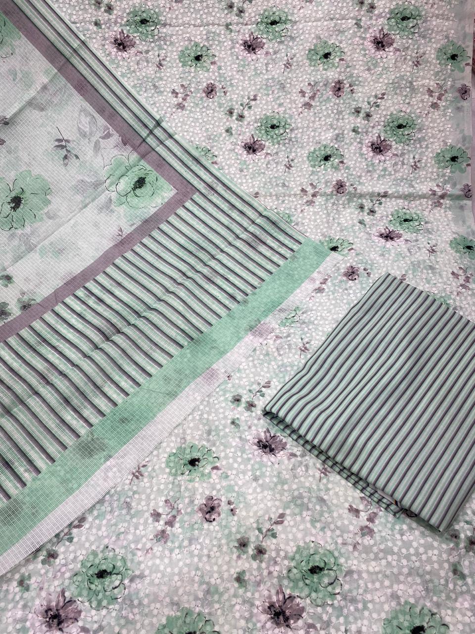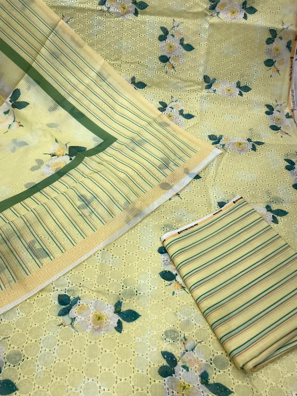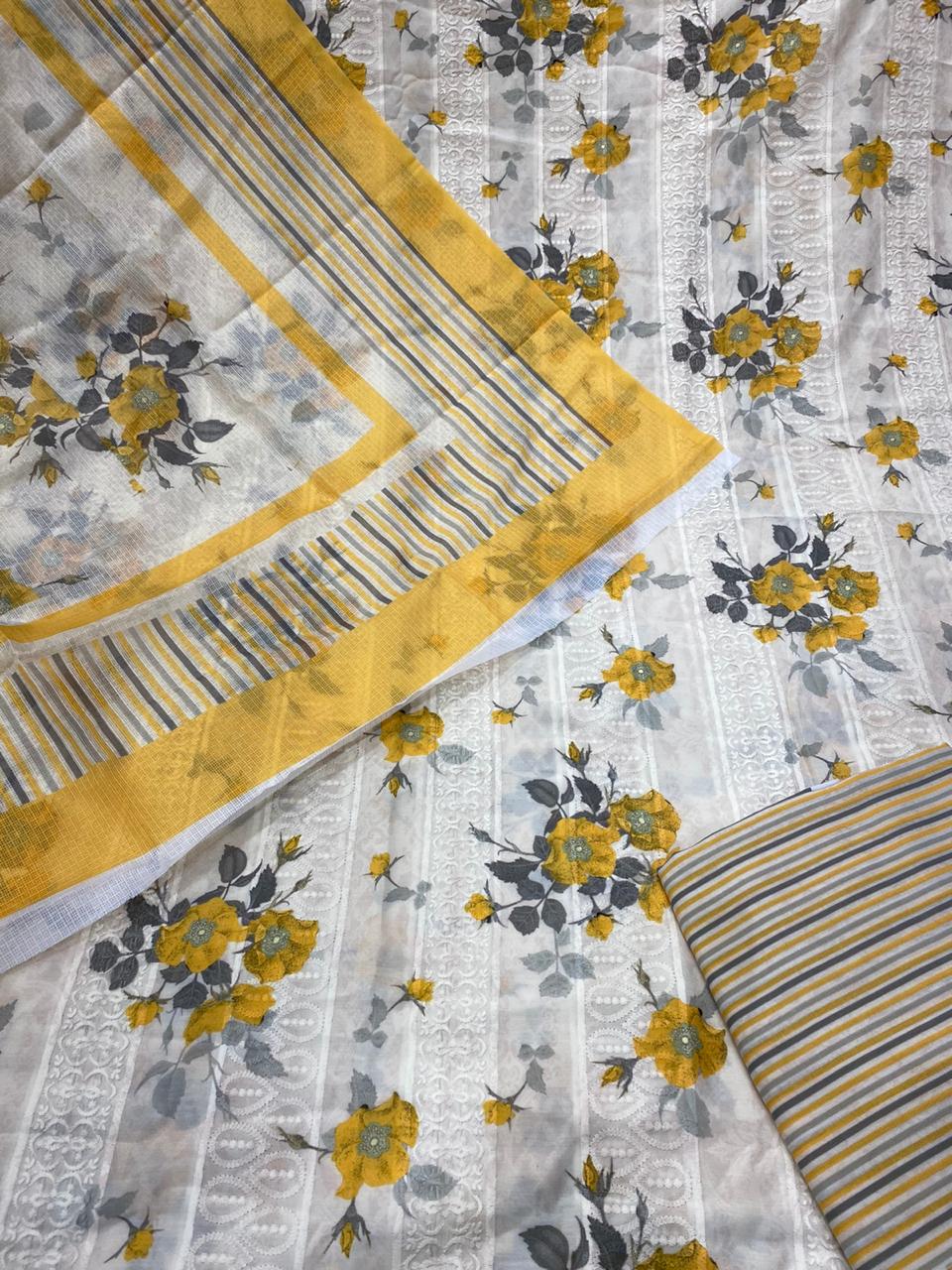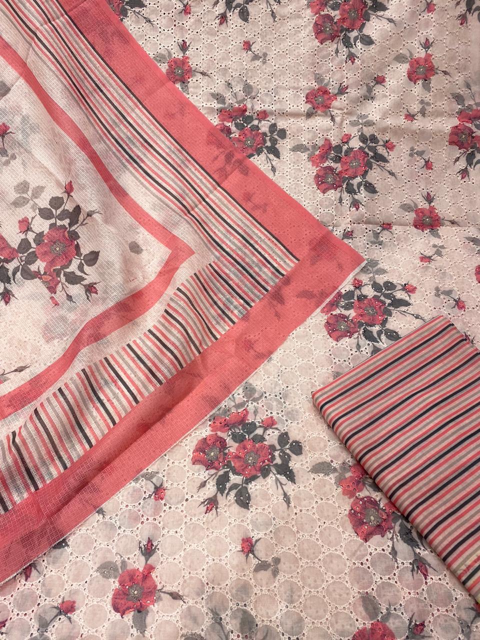 Cotton chicken Embroidey with digital print shirtteam up with 2 by 2 cotton stripes bottom 3 meter Kota Doria digital printed dupatta