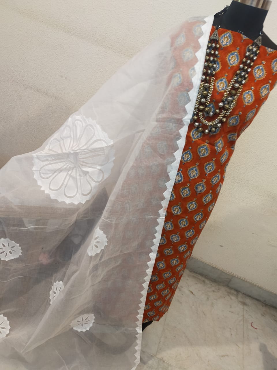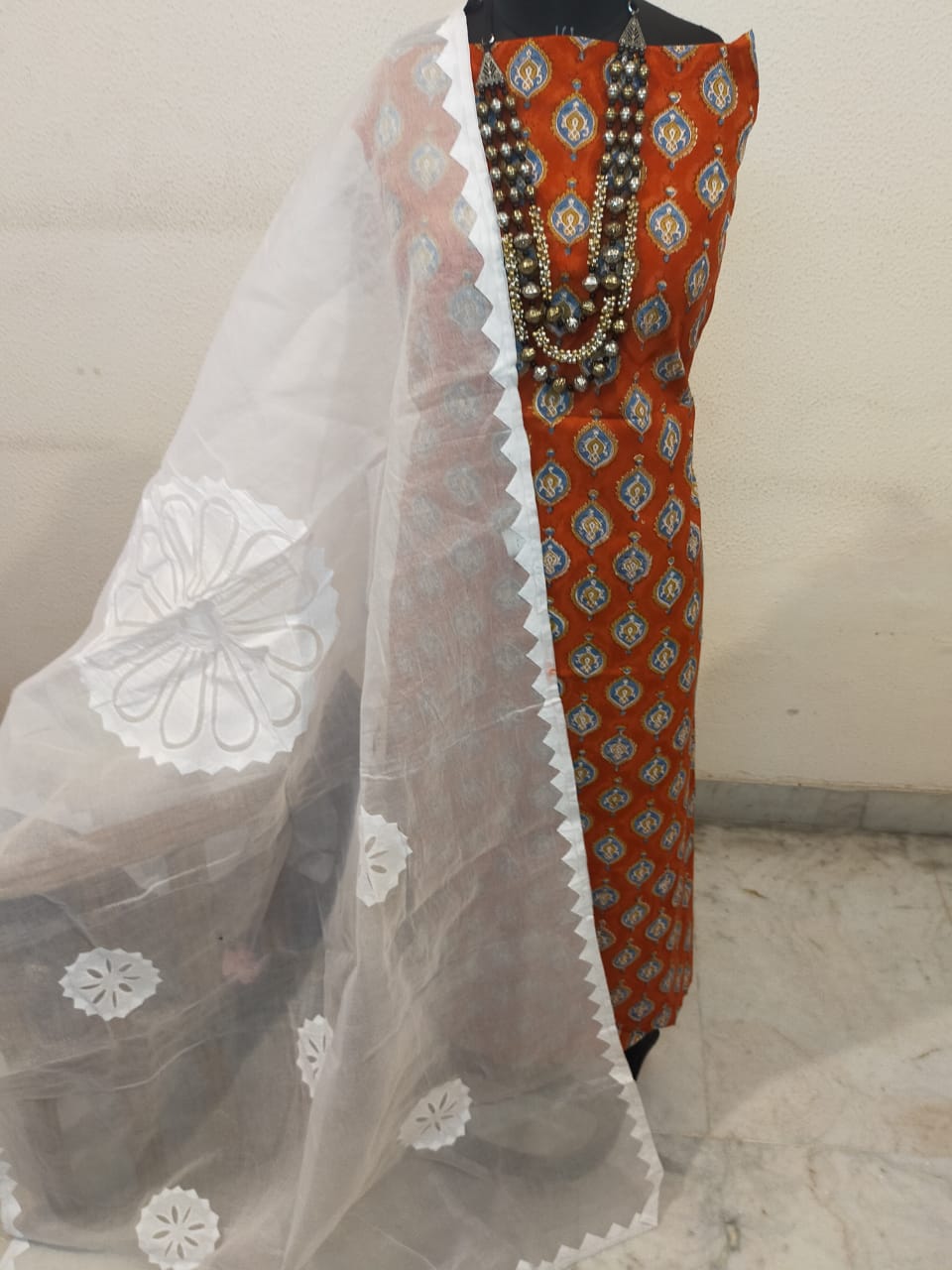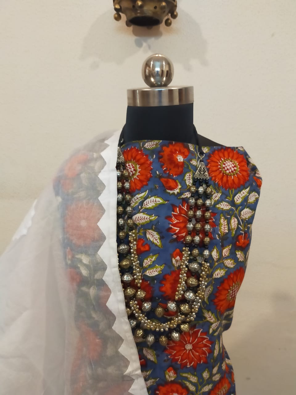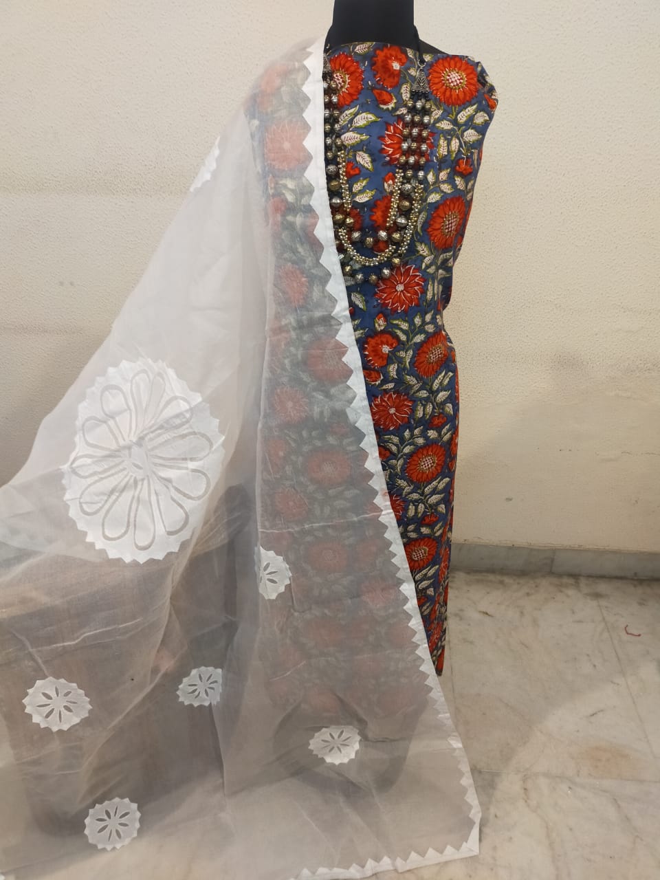 Pure cotton hand block print top with pure cotton applique work dupatta