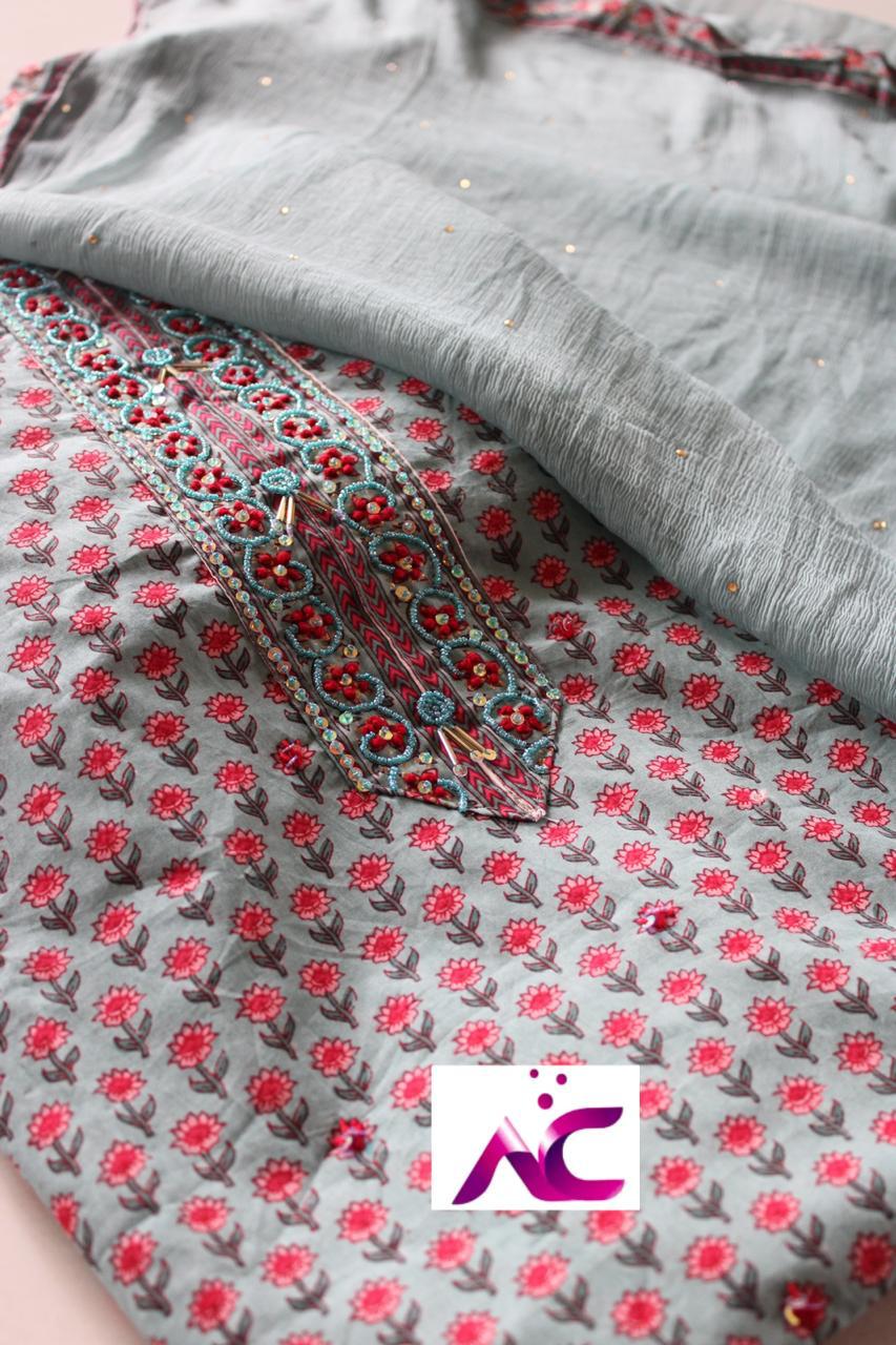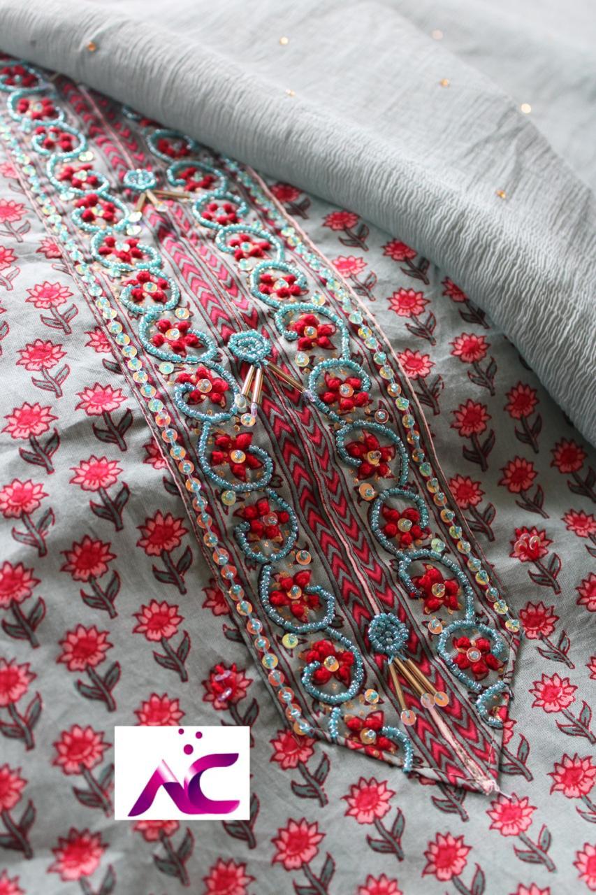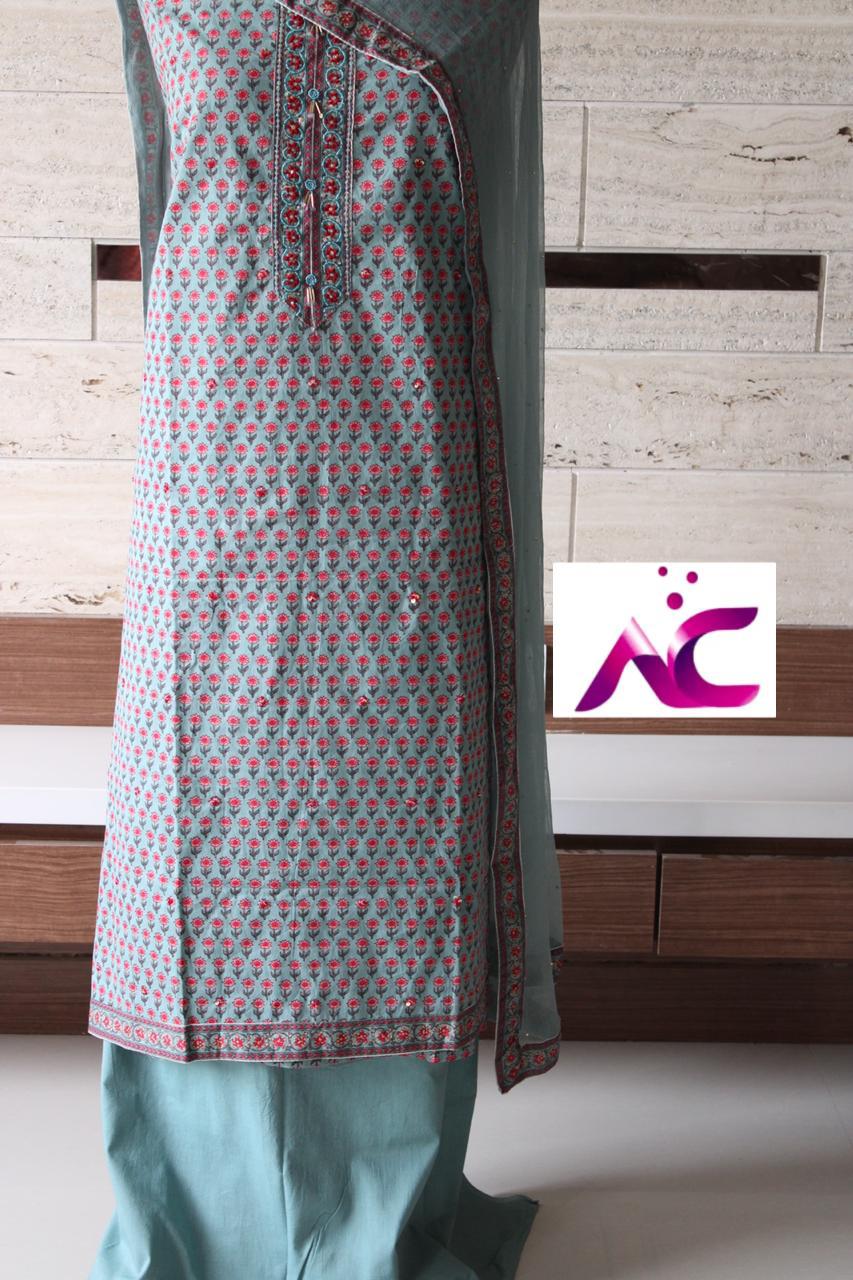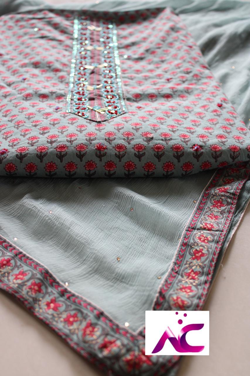 Beautiful cotton printed shirt with neck hand wrk ??, N all small thread n sequence butties??, Plain bottom??Chiffon dupatta with all over seroski n tapings four sides??