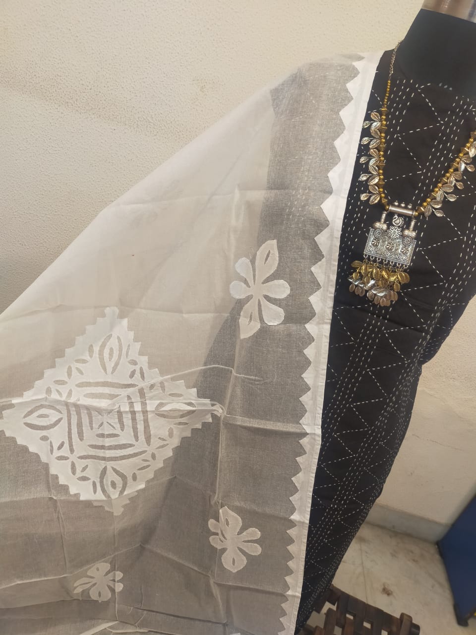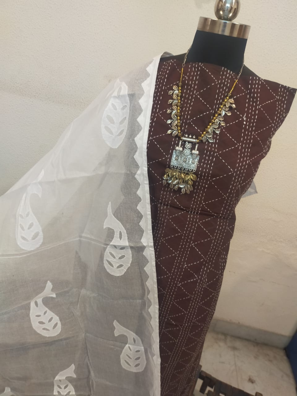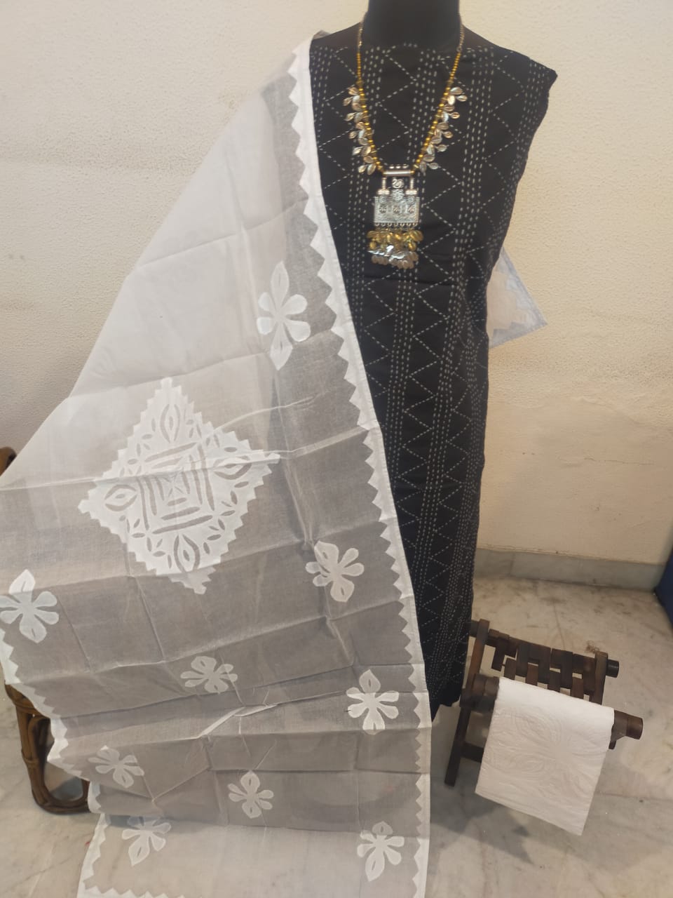 Restocked….. Pure cotton top with anchor thread work on front,Pure cotton applique work dupatta n pure cotton applique work bottom, 2.5 Mt each