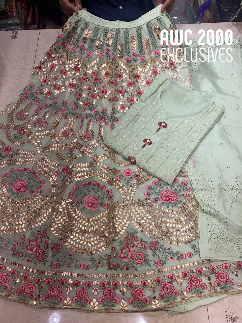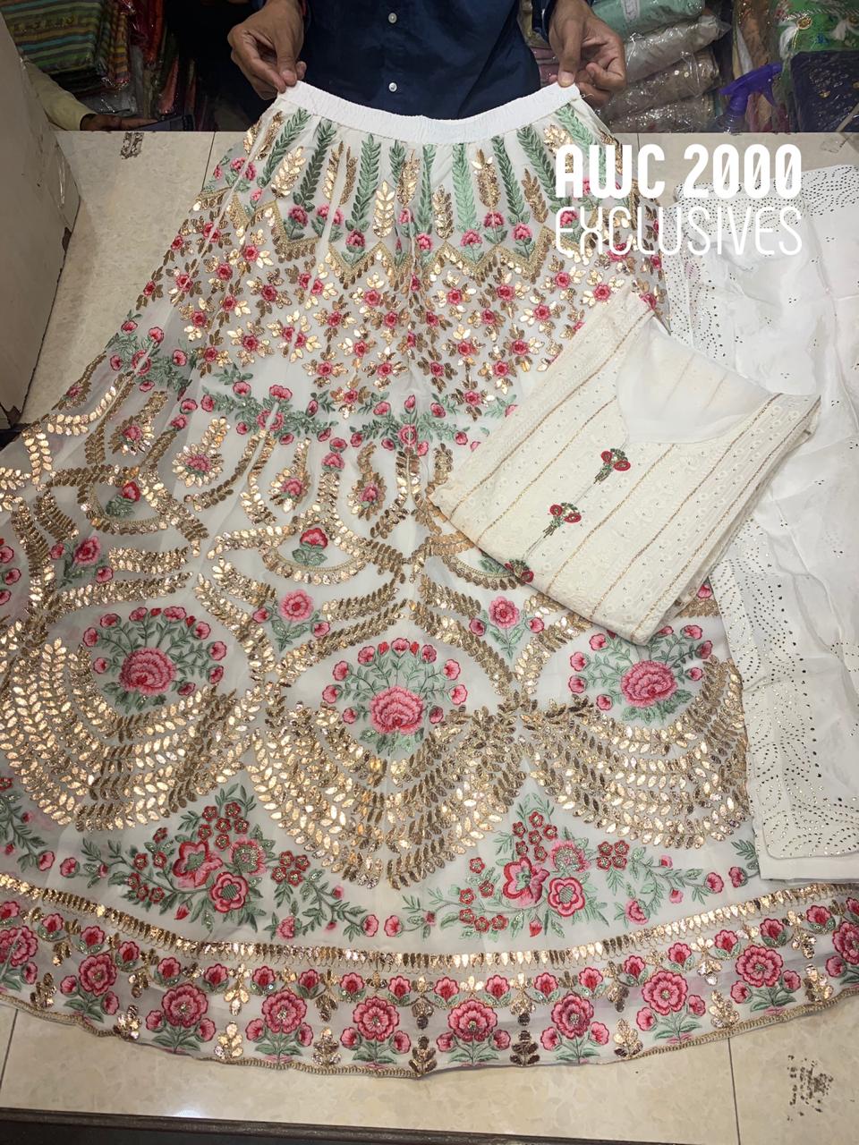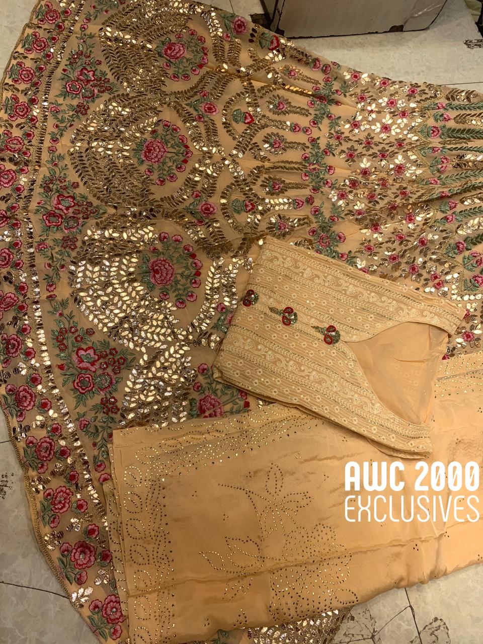 Pure Georgette Shirt*WORK*- Designer Sippy and thread Work, *Skirt*-Pure Georgette Skirt With Sippy Work and Resham thread work along *original Gota* and sequence work, *Dupata*- Pure chinon dupata with Gold Dew drops work top quality, Chest-50”
