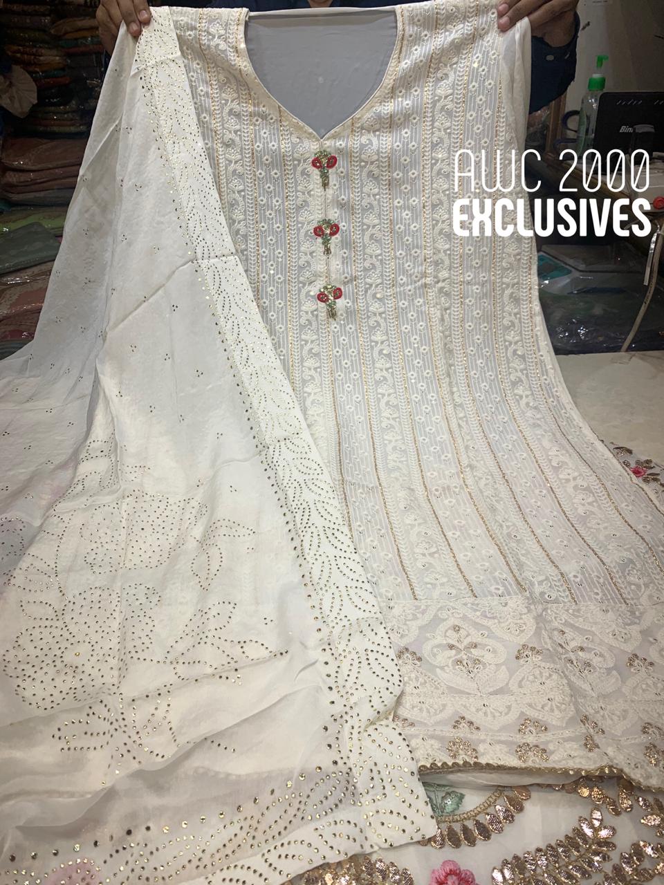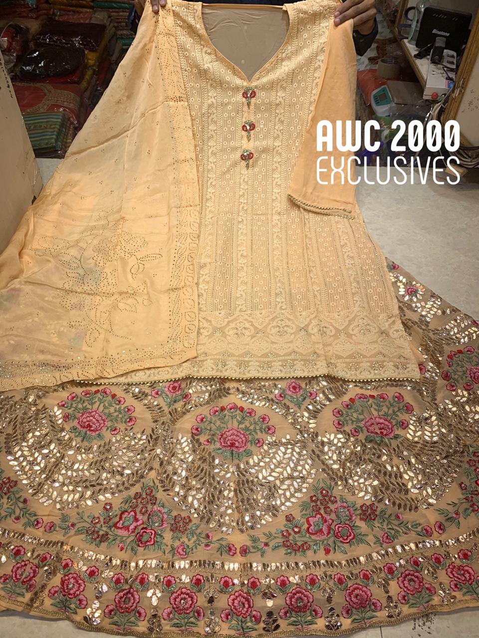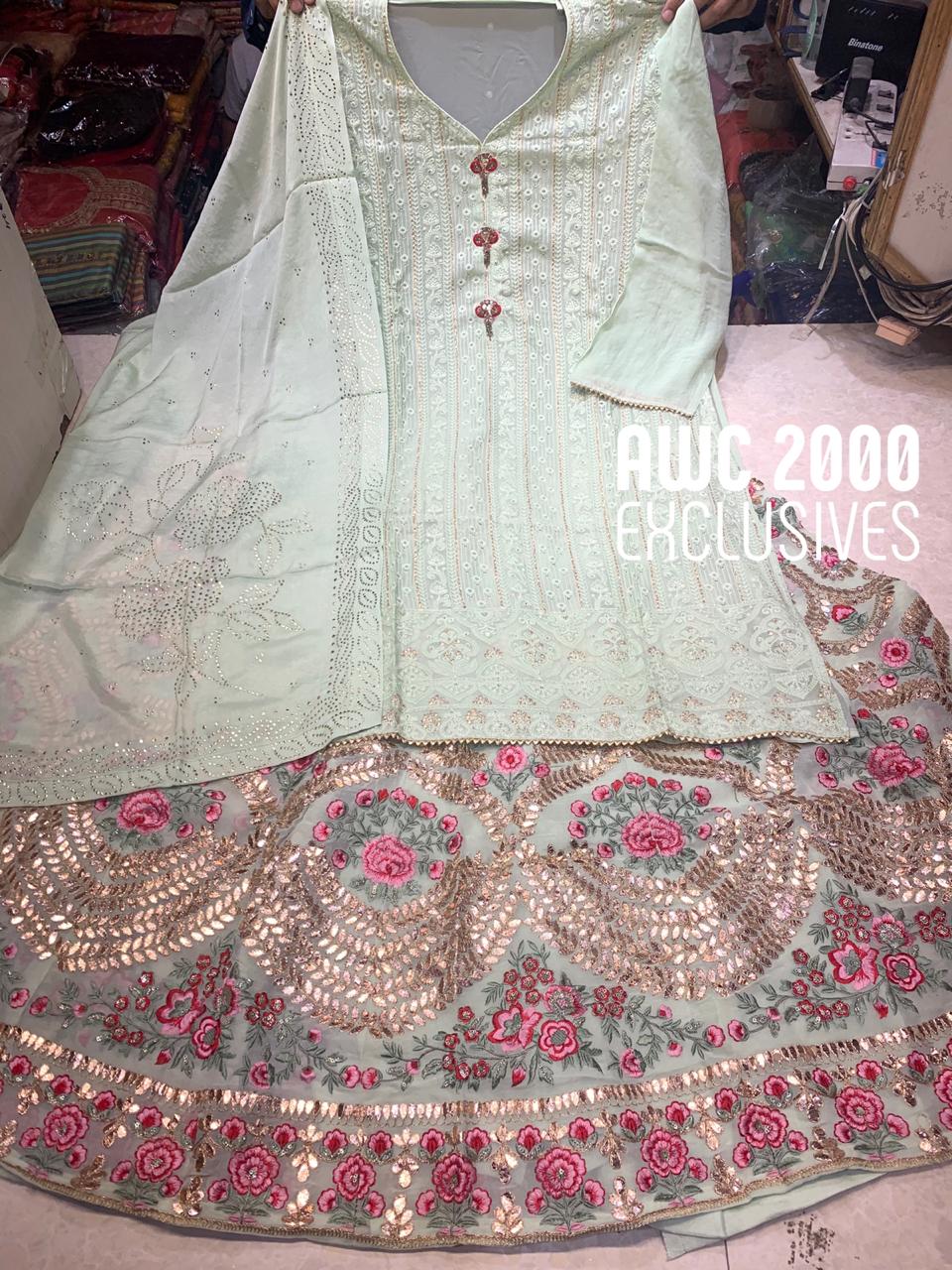 Pure Georgette Shirt*WORK*- Designer Sippy and thread Work, *Skirt*-Pure Georgette Skirt With Sippy Work and Resham thread work along *original Gota* and sequence work, *Dupata*- Pure chinon dupata with Gold Dew drops work top quality, Chest-50”
