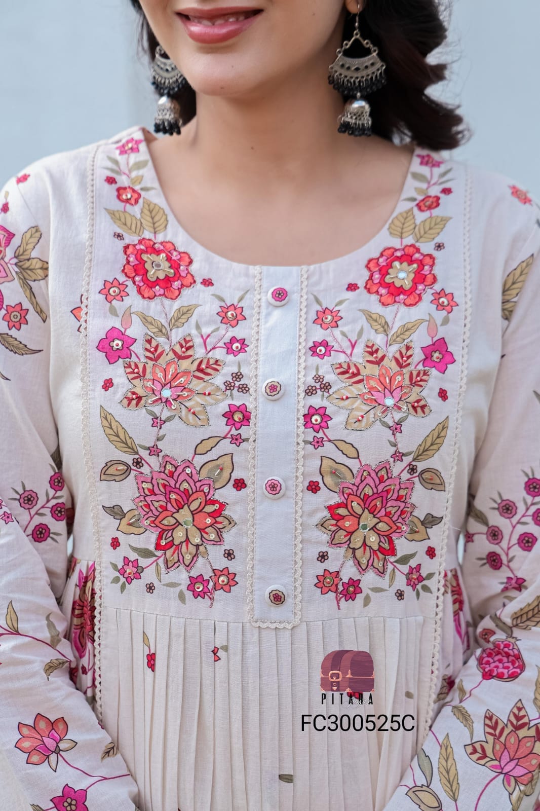 **Premium cotton digital print kurta with handwork and crotchet lace work with pleated pattern paired with cotton pants and cotton duppatta
