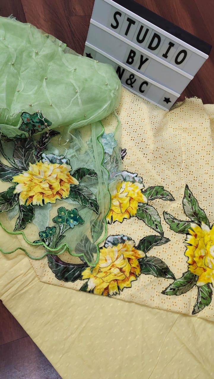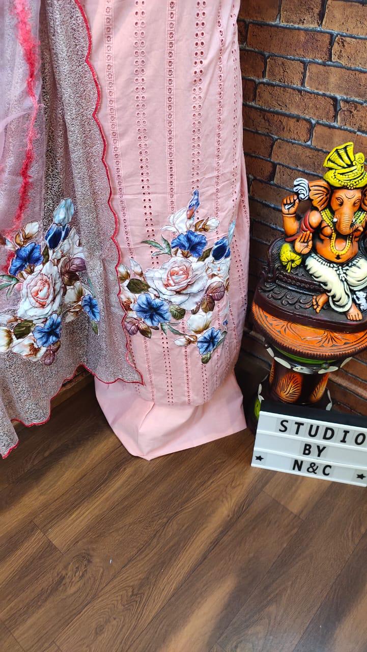 Shirt cotton chikankari 2.5 mtrs with patchwork , Bottom solid cotton 2.5mtr , Designer Dupatta net 2.5 mtr with patchwork, and scalping..