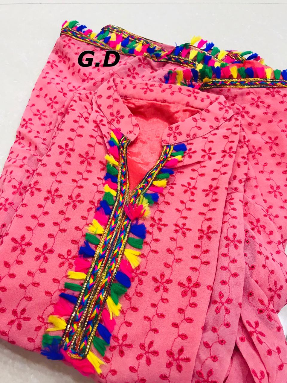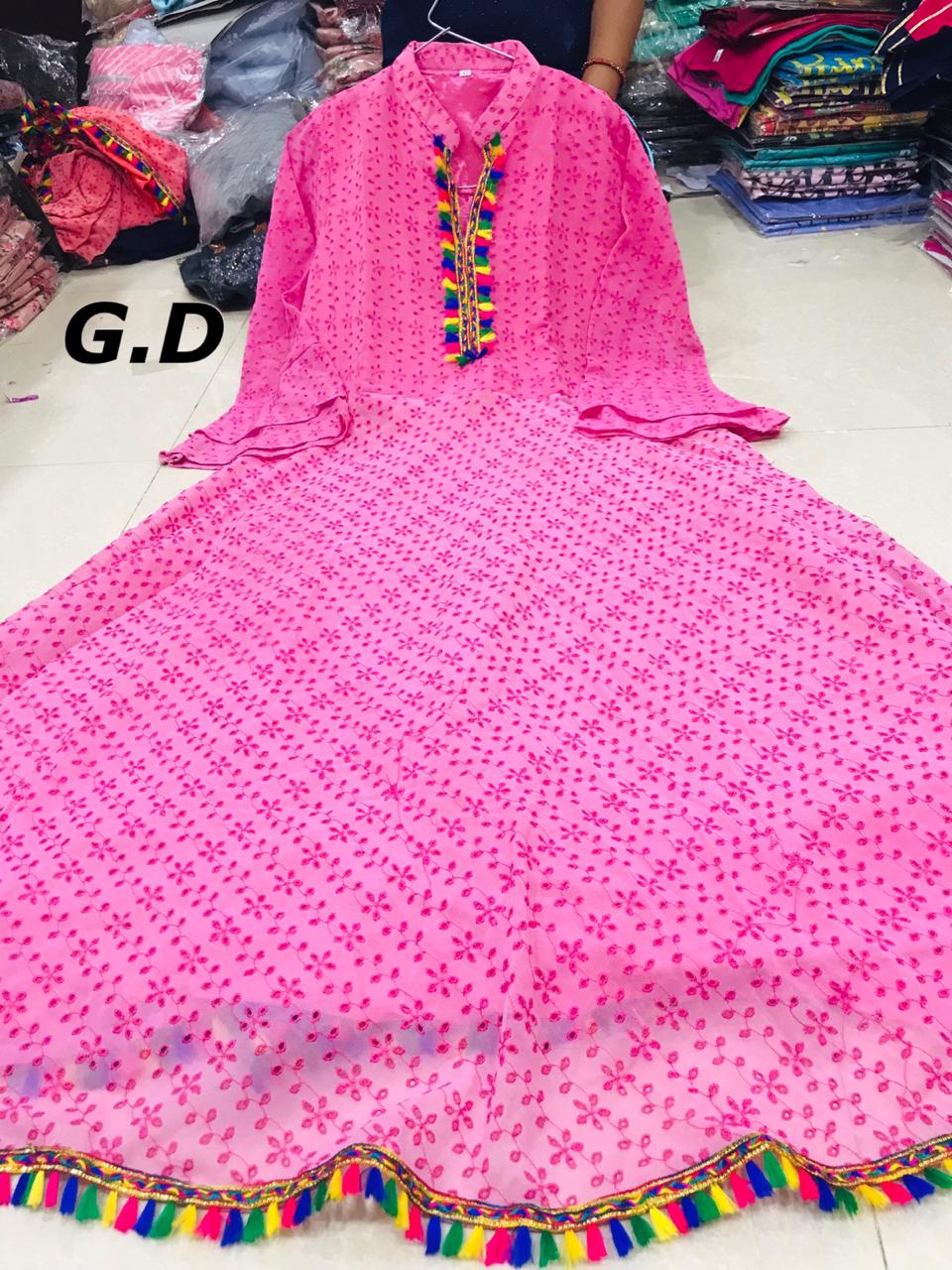 Chicken georgettee flairy gowns with embroidery and bell sleeves having attached inner inside , *beautiful colorful laces on neck line and ghera*, Size -l,xl,xxl