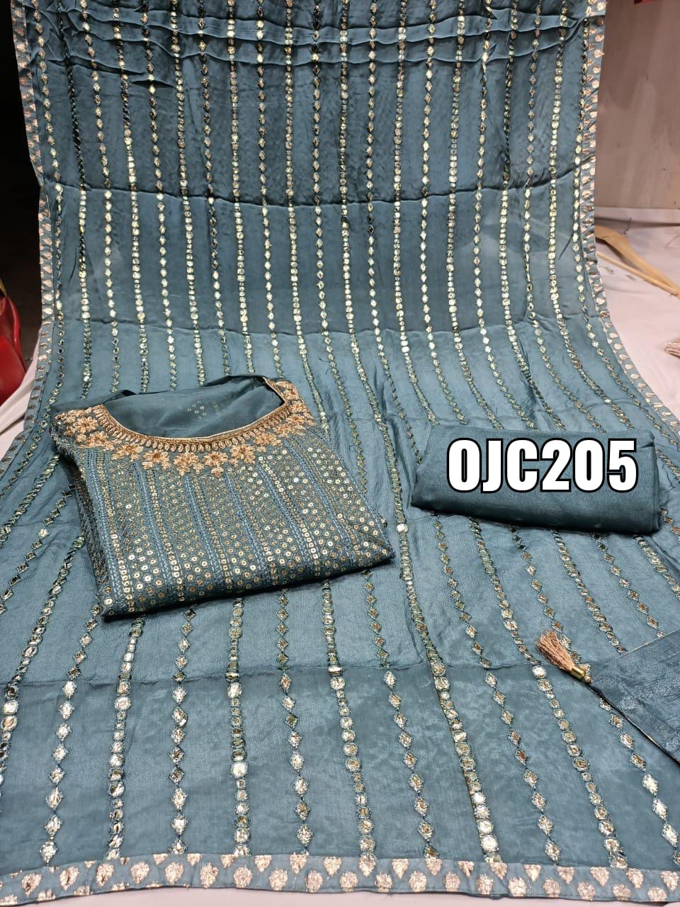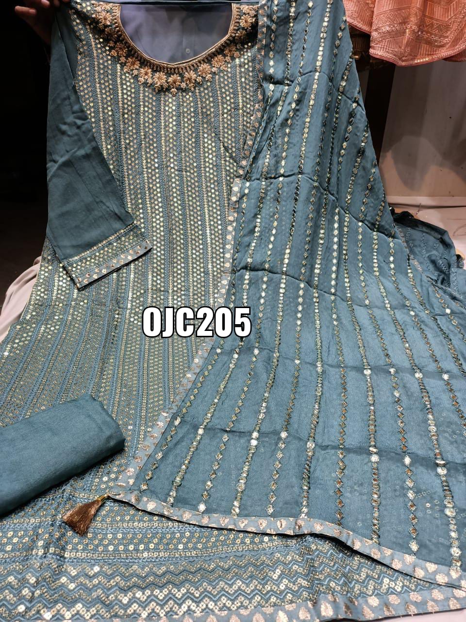 Gorget Semistiched Shirt With Sequence $ Hand Work , Santoon Bottom, Chinnon Dupatta With Leather Work ,Chest Size – 50,Length- 48.