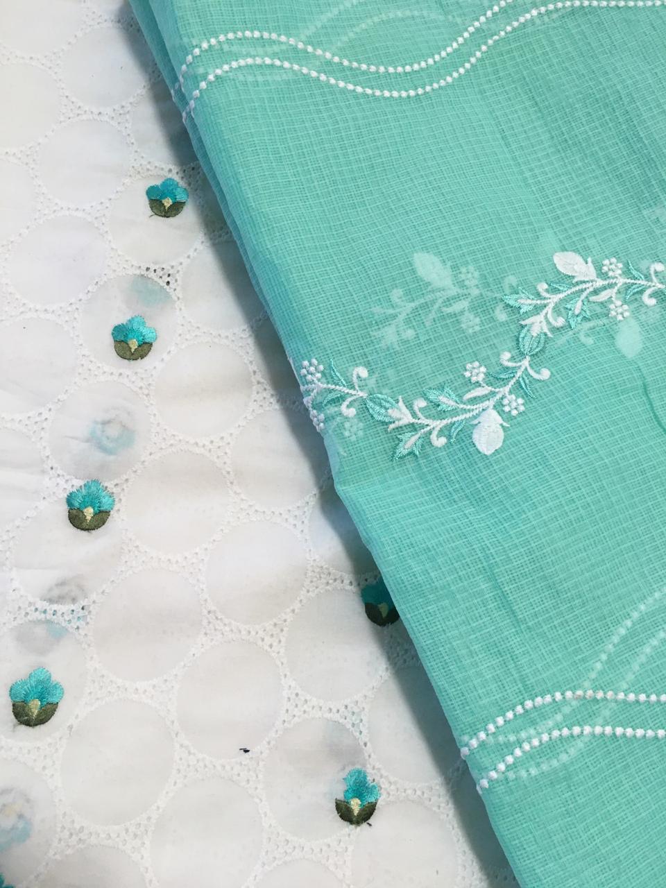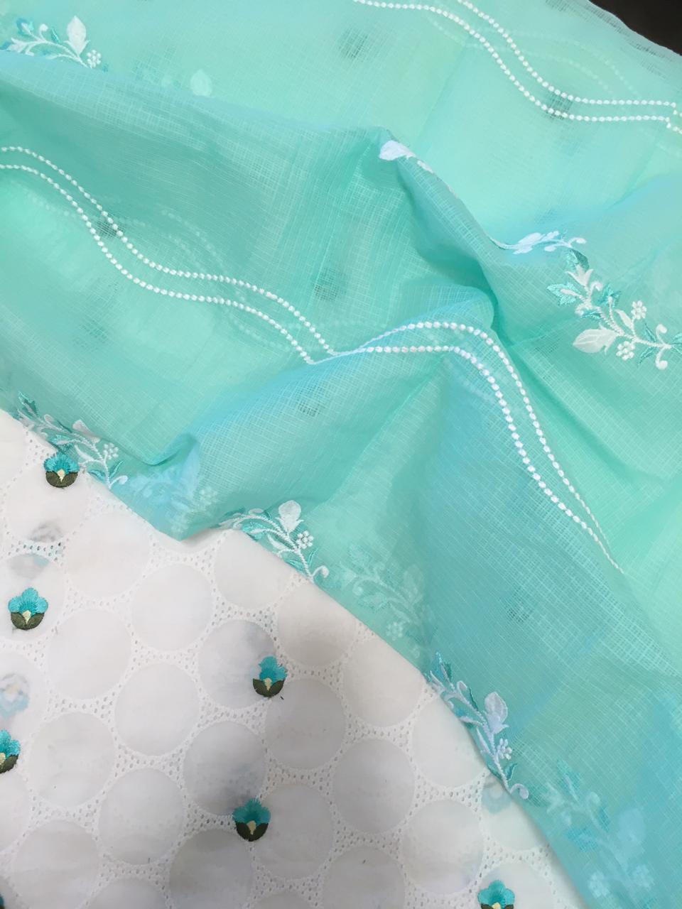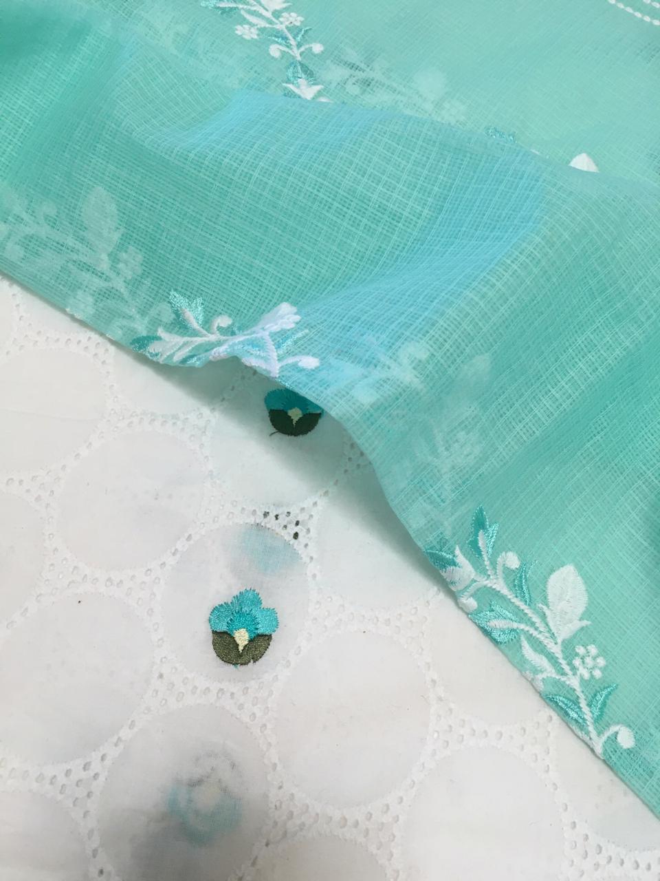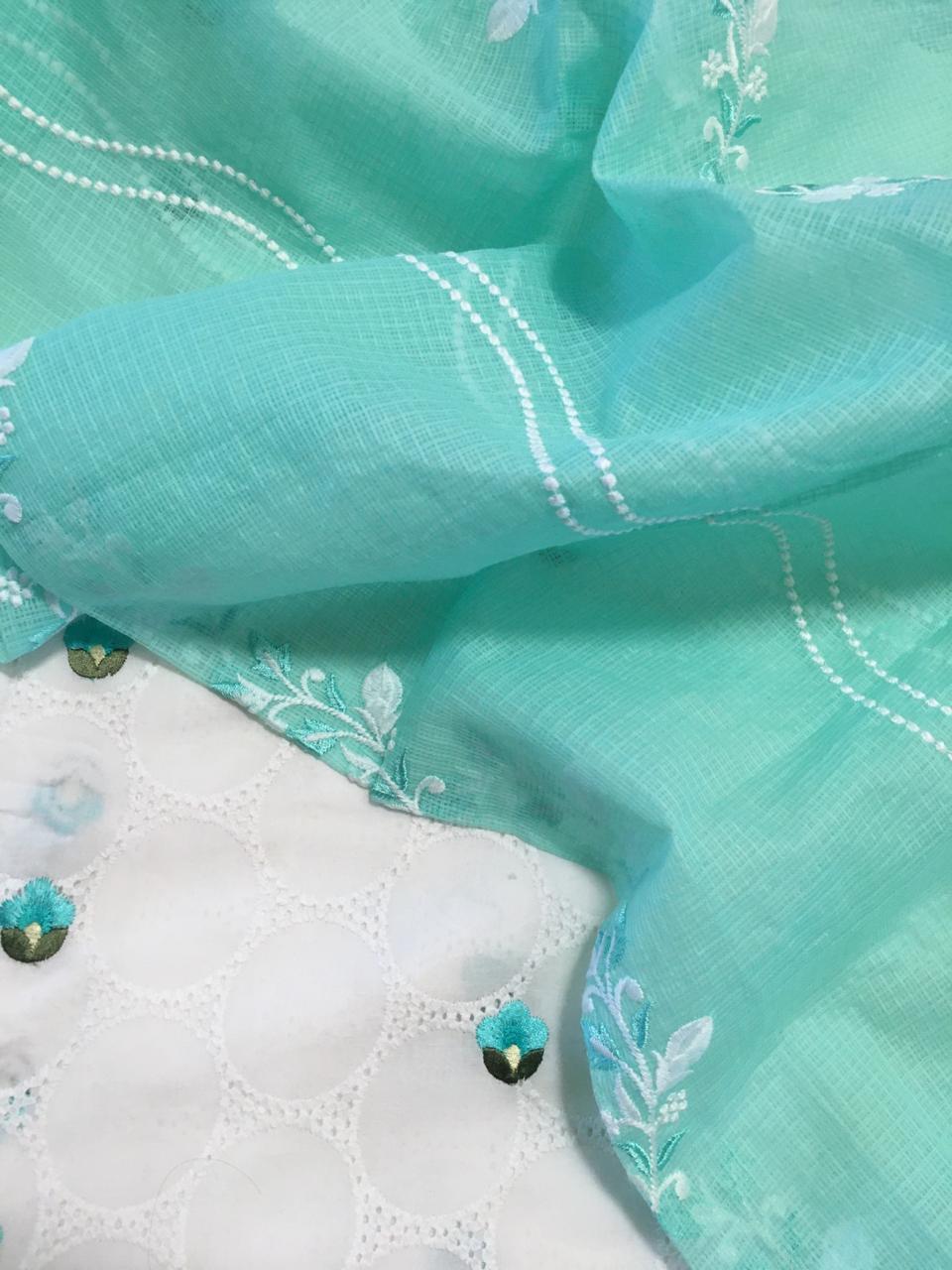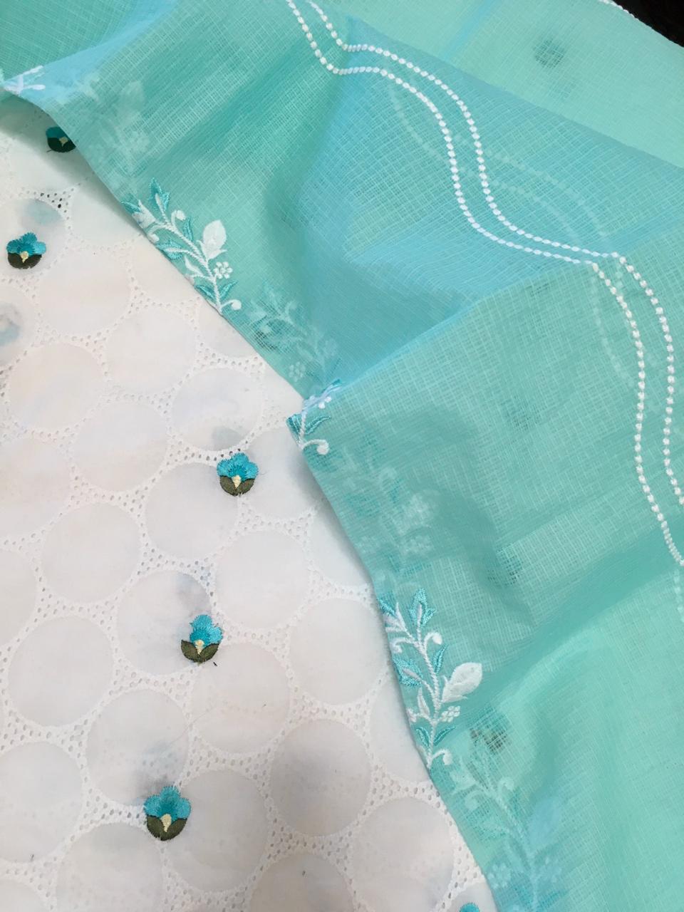 pure cotton football hakoba chikan kurta with beautiful embroidery on it paired with very elegant pure kota cotton embroidered Dupatta…(colour is bluish pista)