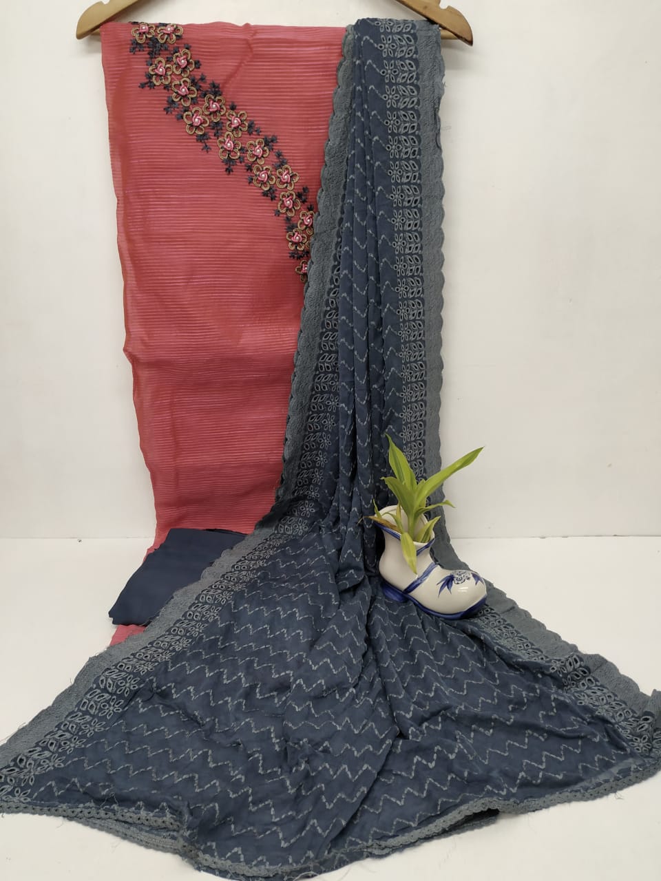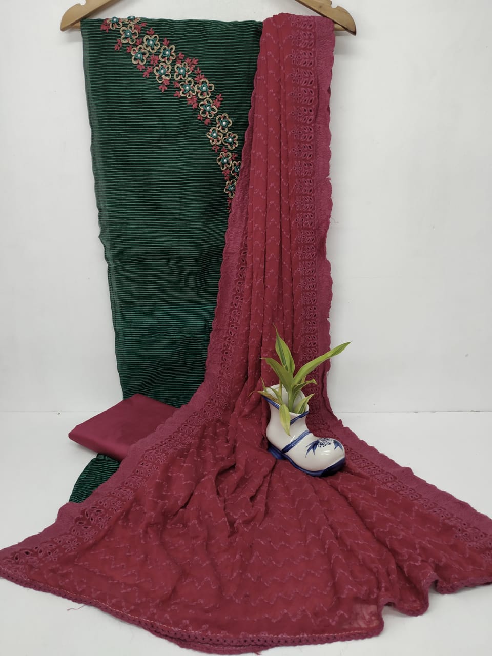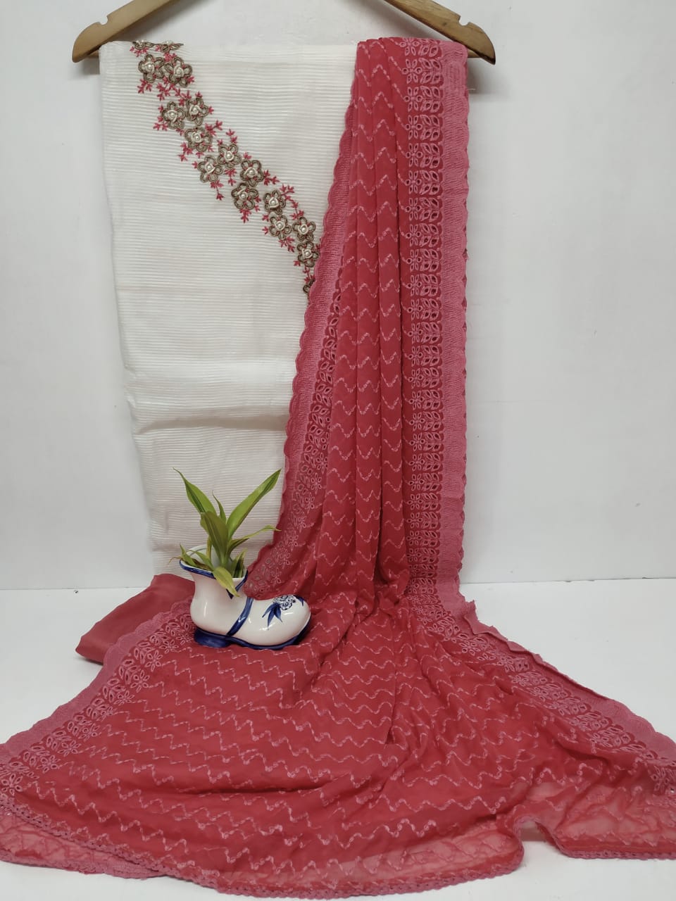 Silky Kota Handworked Top With Cotton Silk Bottom And Embroidered Chiffon Dupatta With Cutwork Border.