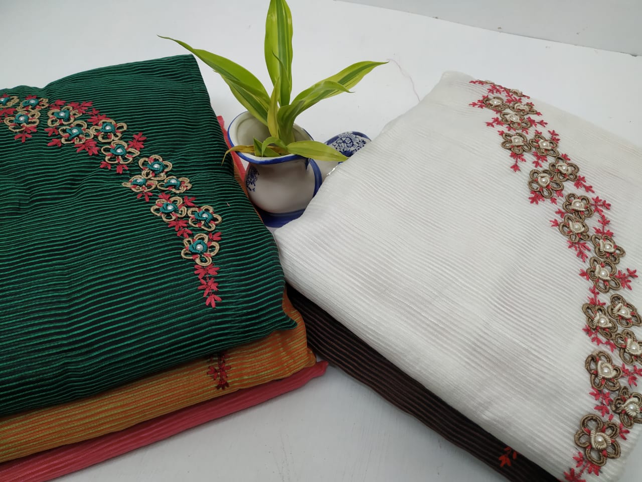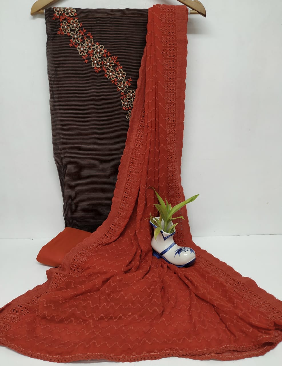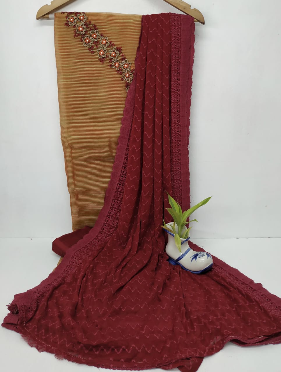 Silky Kota Handworked Top With Cotton Silk Bottom And Embroidered Chiffon Dupatta With Cutwork Border.