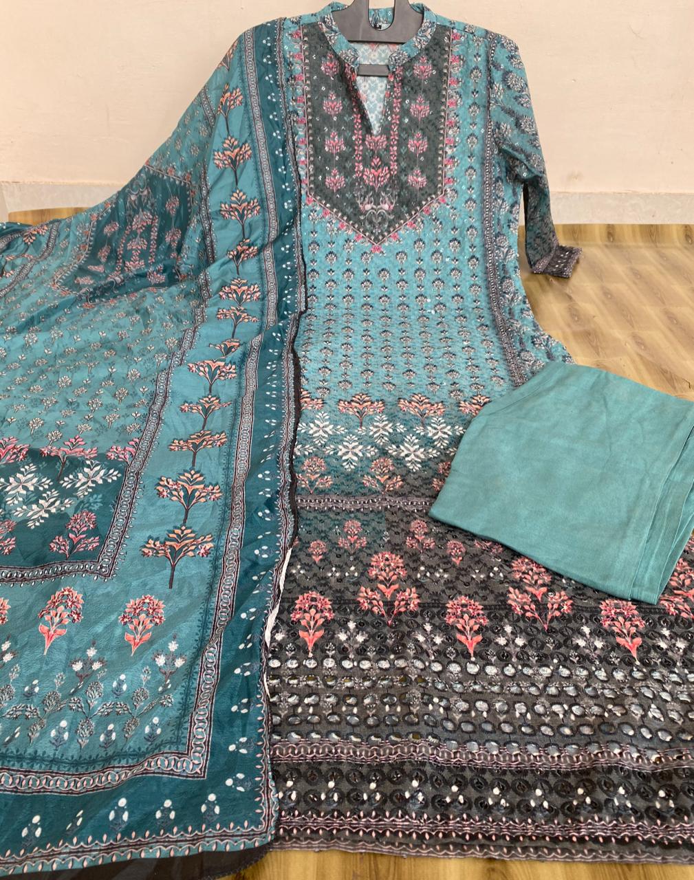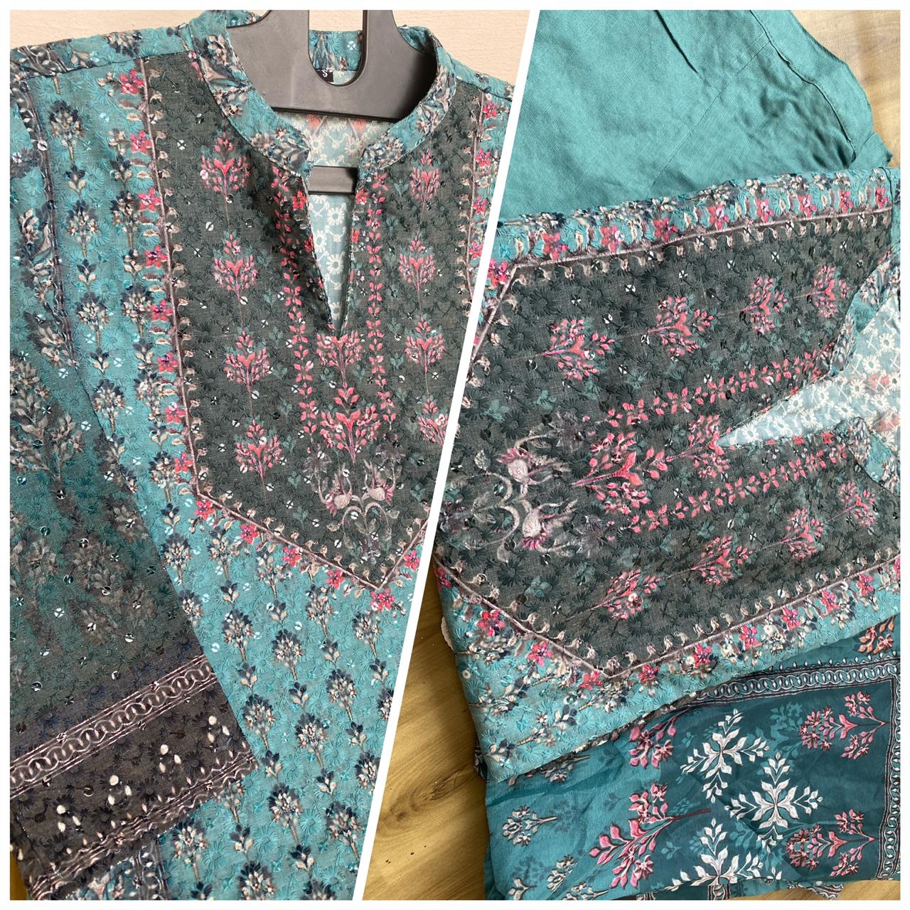 Beautiful Straight cut Cotton Shifli Kurti with overall embroidery,Sequence Work And Block Print paired up with Rayon Plant with Beautiful Printed Muslin Scarf, Size – 38 to 46.