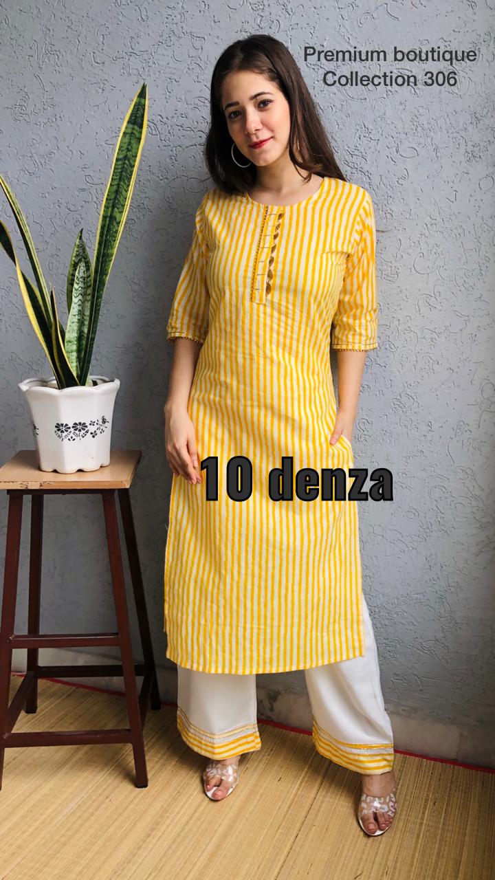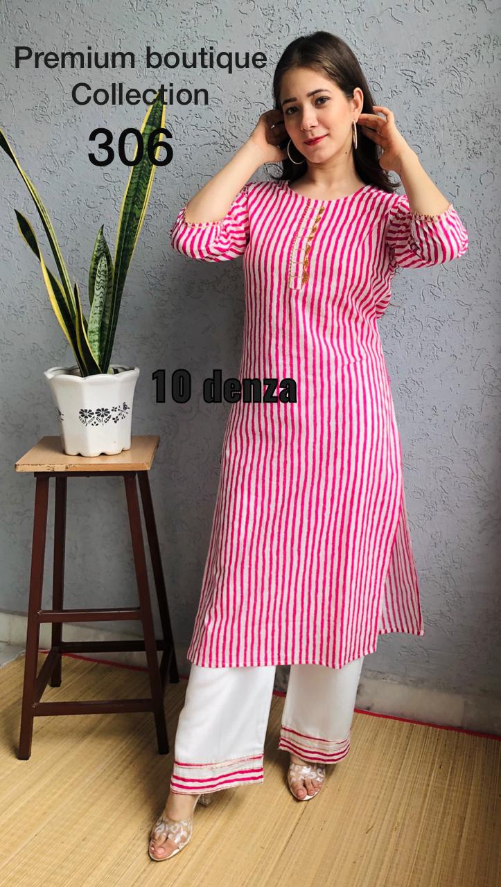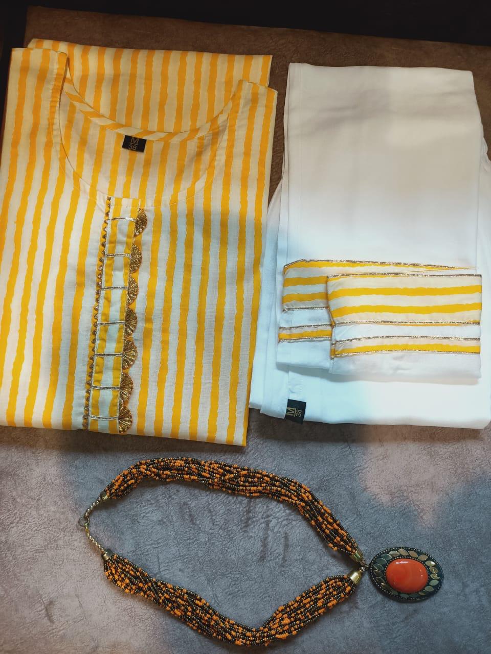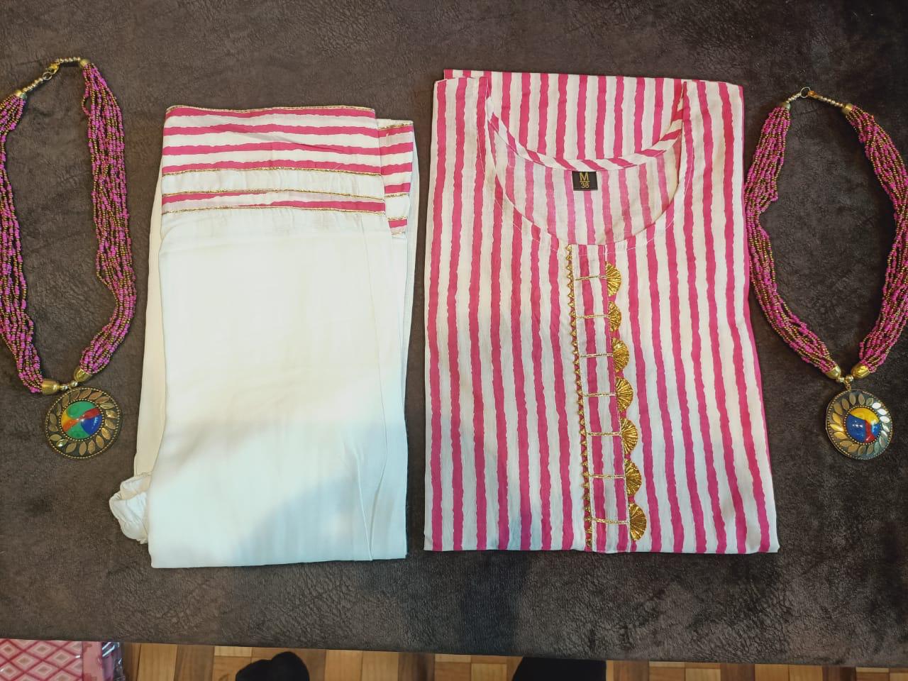 Beautiful stripe cotton cambric kurti with detailing wity gota and combined wity plzzo with pocket and border ,Size 38 to 44 .