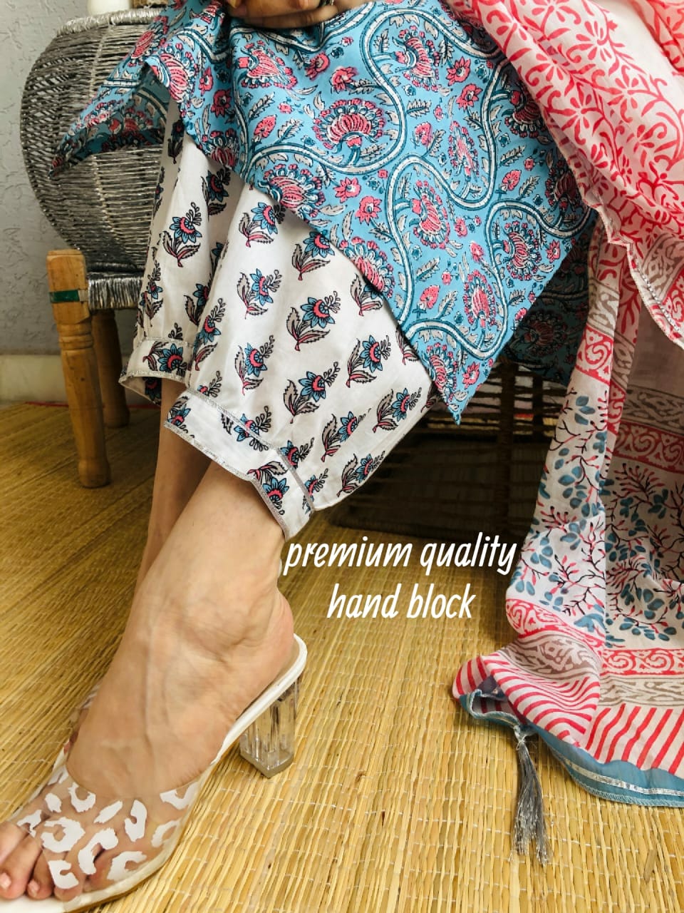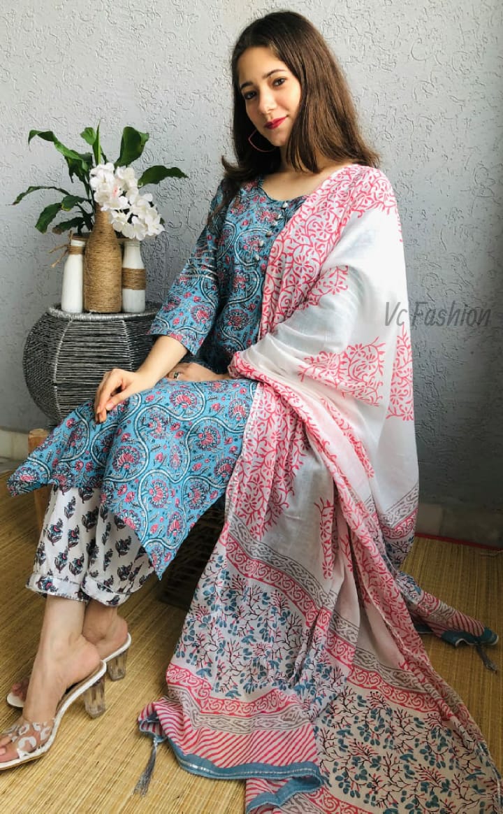 Handblock kurti with fine gota work on sleeves , Handblock stylish pant with gota details and gathering on bottom beautify with Handblock Dupatta with gota and tussels …..Fabric : Premium Cotton, 38/40/42/44 sizes Avl