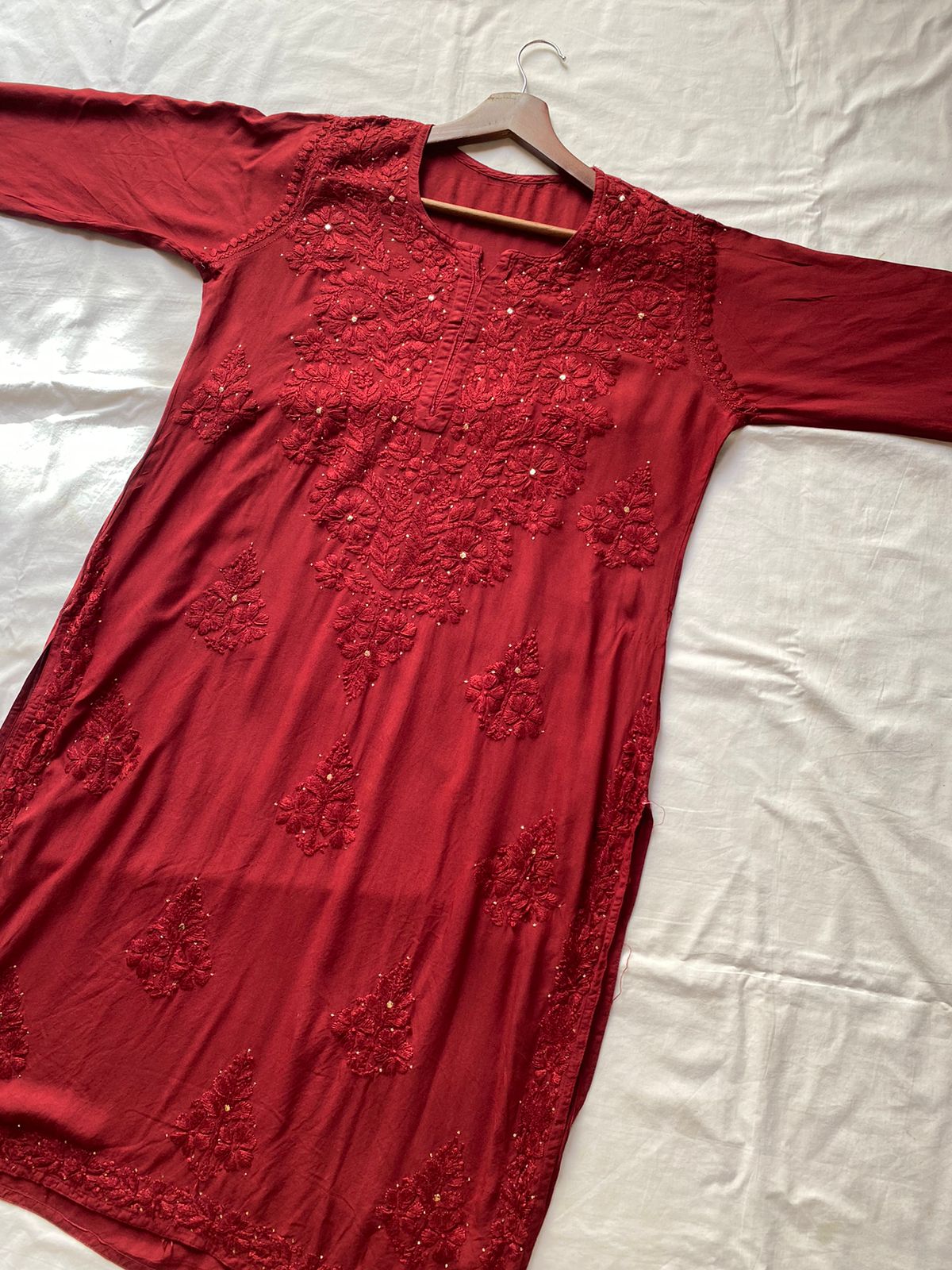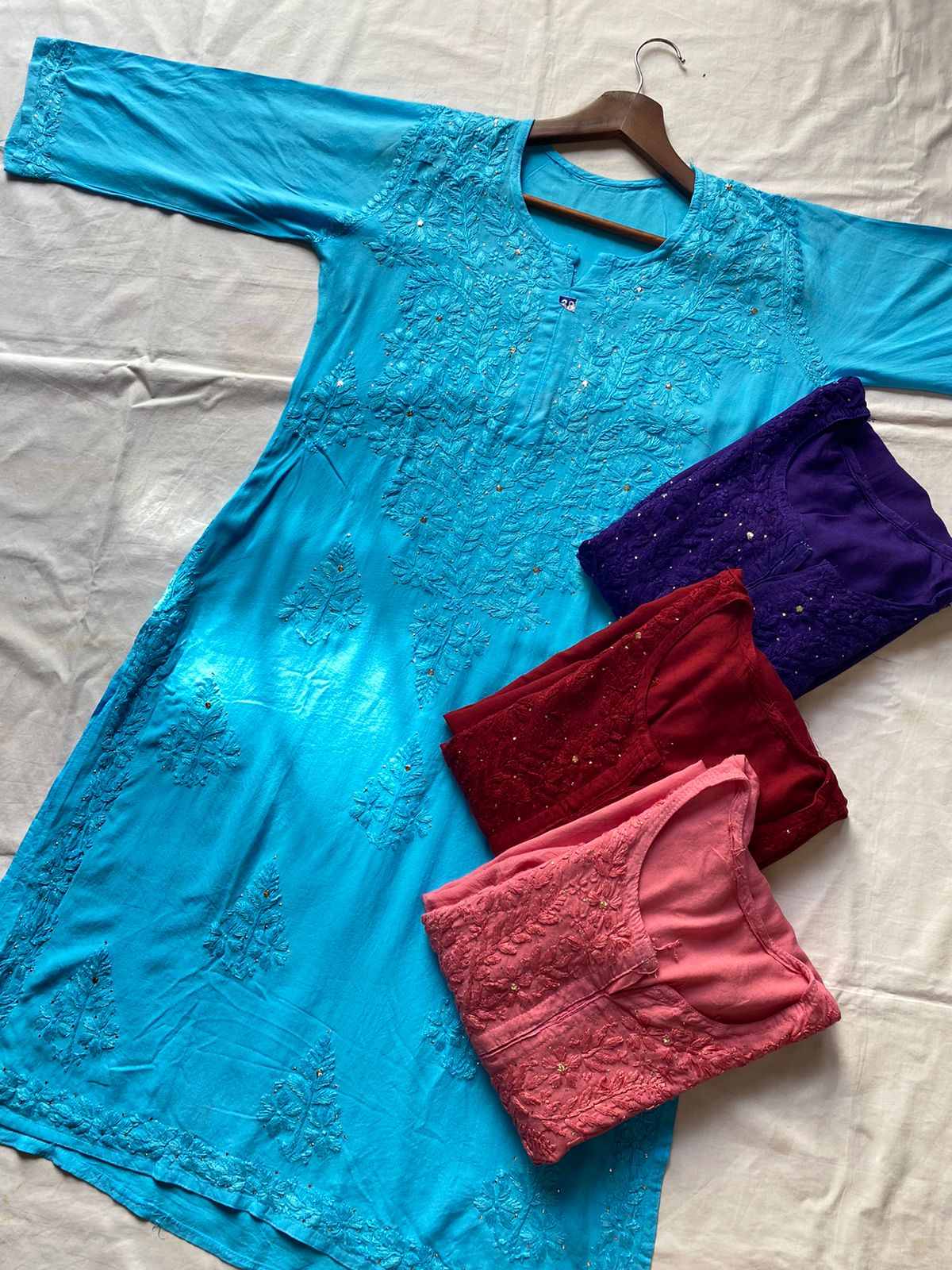 #Chikankari Mukaish work Kurti, fabric:- Rayon, work:- Mukaish*, Size:- *38 to 44* *Sleeve length 19”*