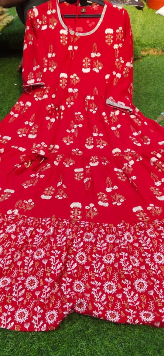 *rayon slub Tier gown with handblock and handwork of dabka and pitten *seperate Robe with motives like sepia and coins to enhance the waistline ,Sizes m/38-xxl/44,Flare – 8m approx ,Length – 50/51,Fabric – heavy rayon slub.