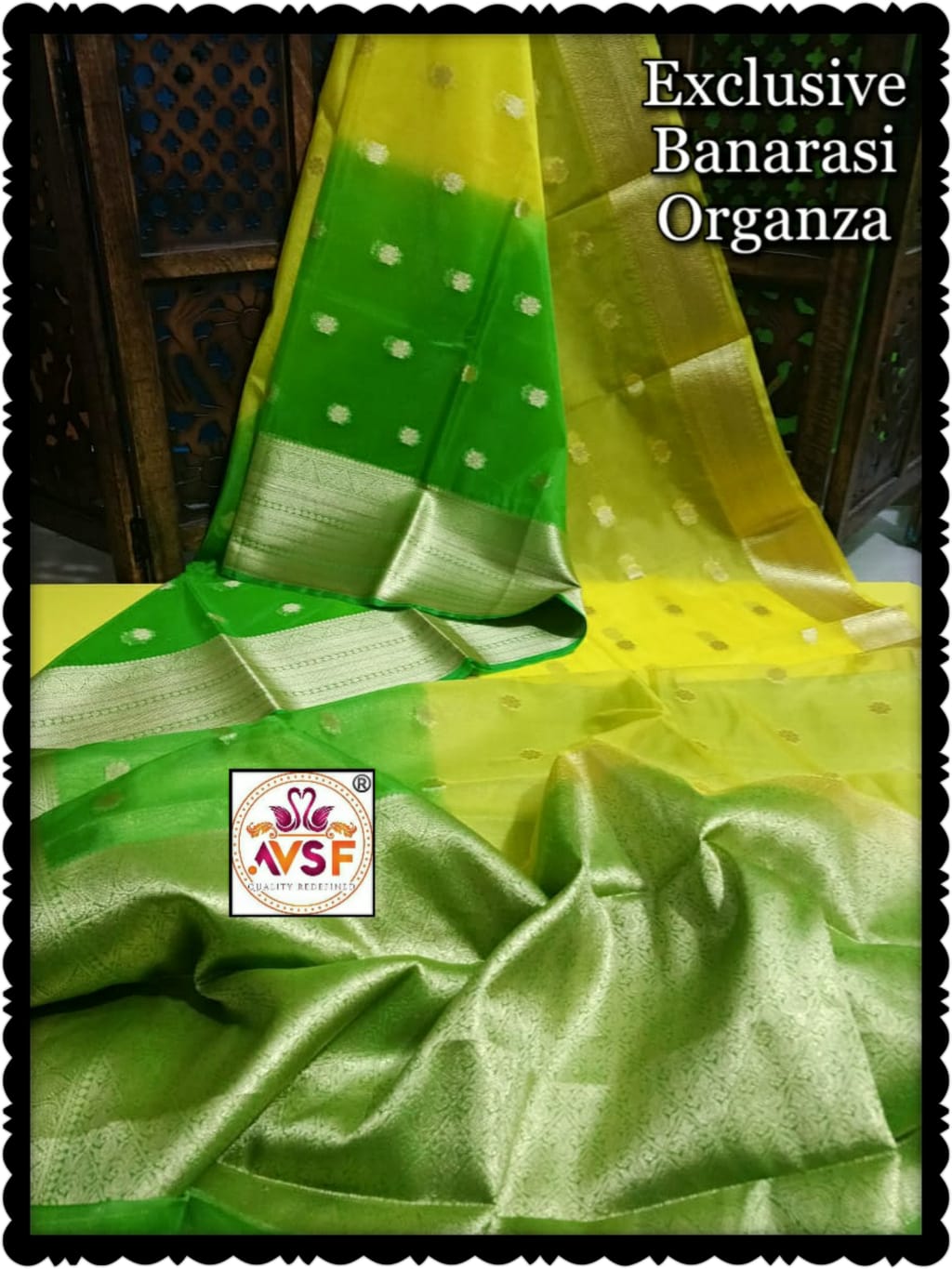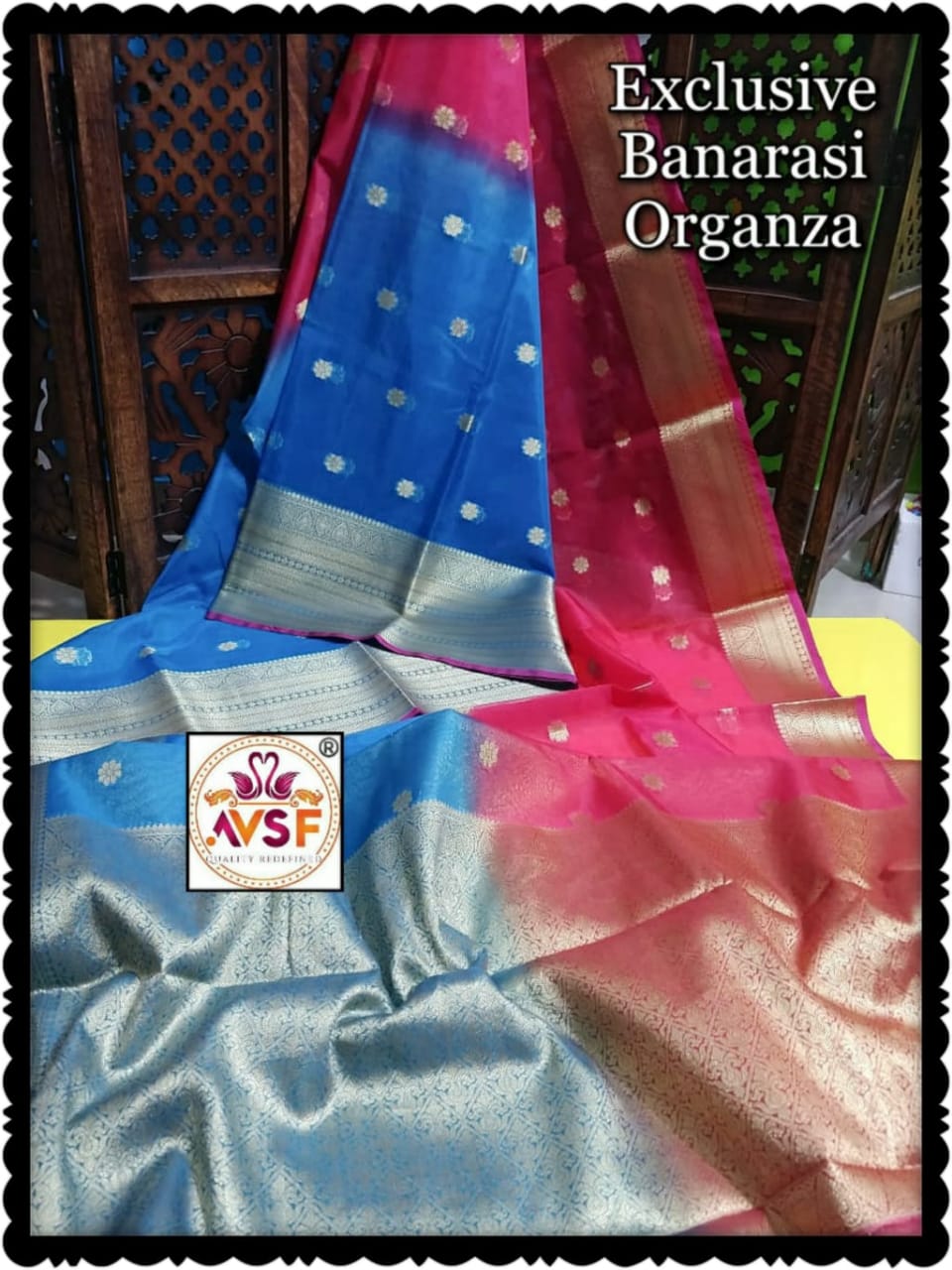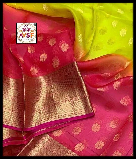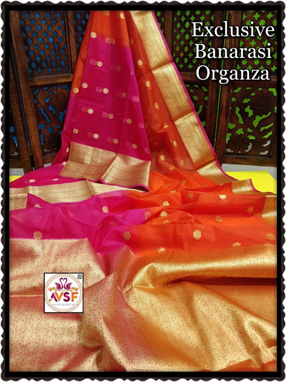 Banarasi Organzaa Weaves in Half n Half Style with elegant buttas n Rich weaving on border Fabric : Pure banarasi Organzaa with Rich Boutique style zari pallu, full body has zari buttas n rich border…with Attractive Golden brocade blouse blouse.