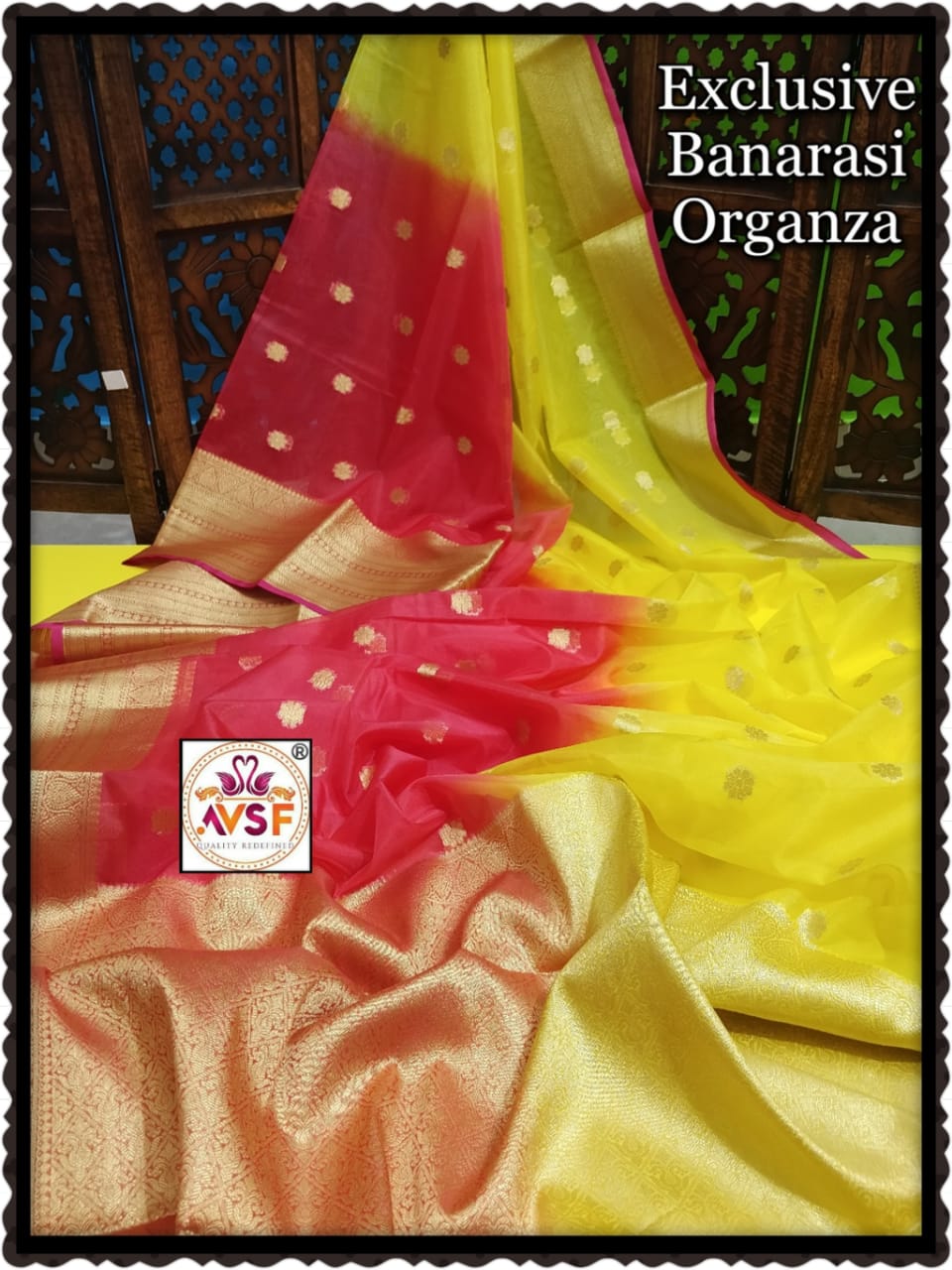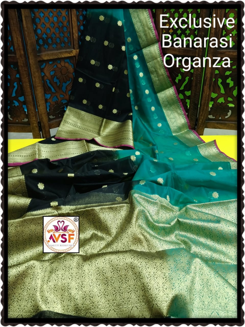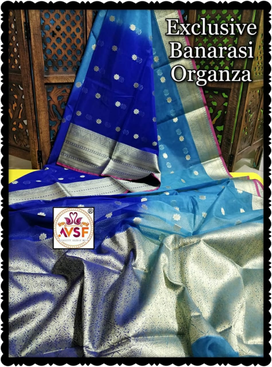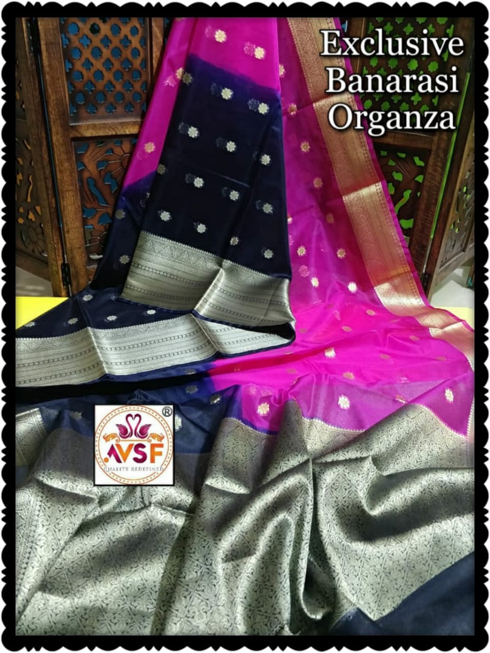 Banarasi Organzaa Weaves in Half n Half Style with elegant buttas n Rich weaving on border Fabric : Pure banarasi Organzaa with Rich Boutique style zari pallu, full body has zari buttas n rich border…with Attractive Golden brocade blouse blouse.