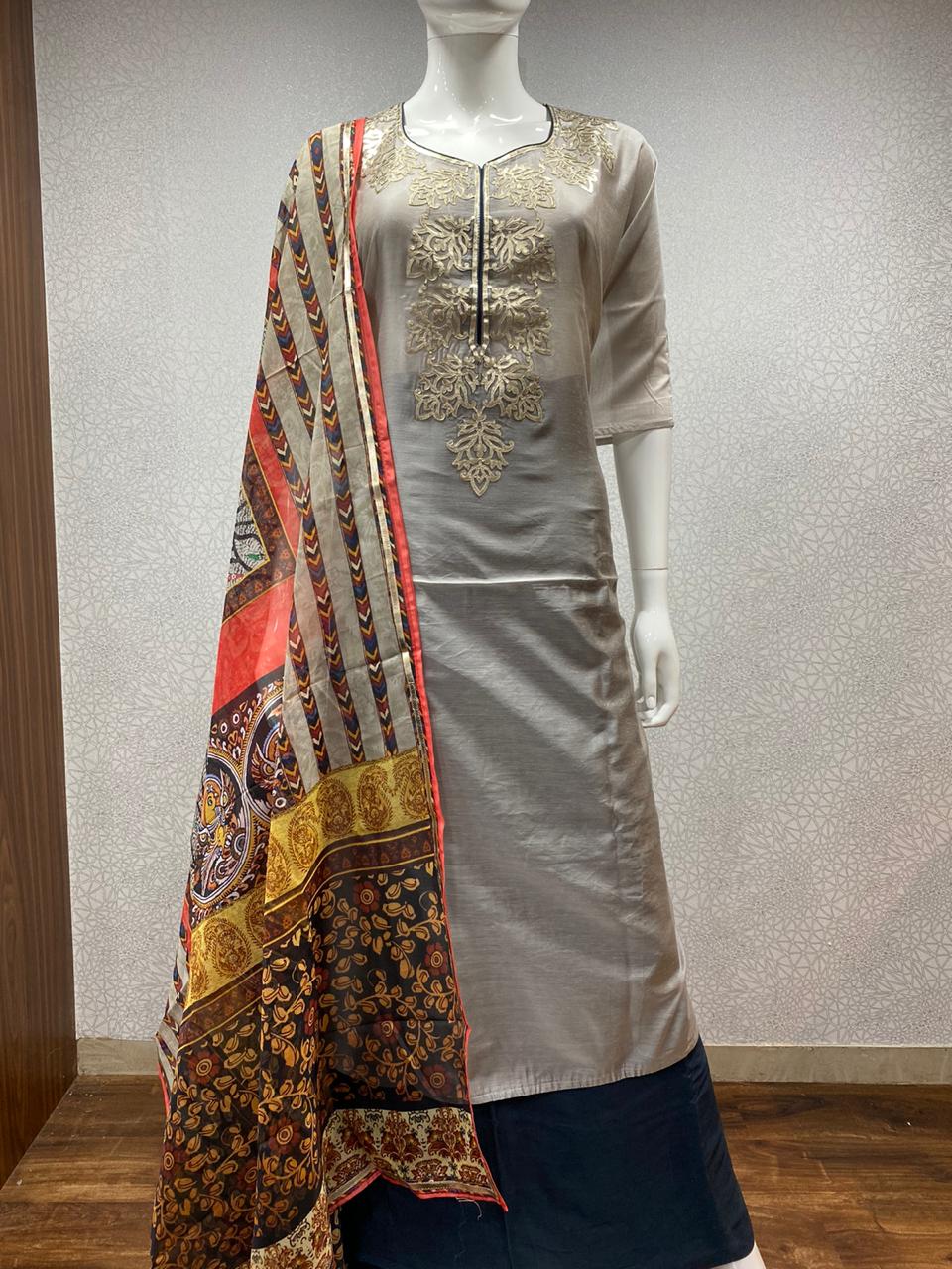 pure Chanderi leather work pure Chanderi digital print duoatta pure santoon bottom.