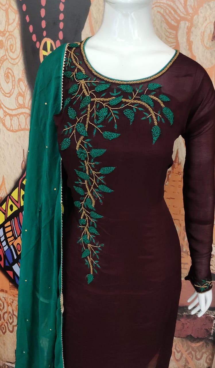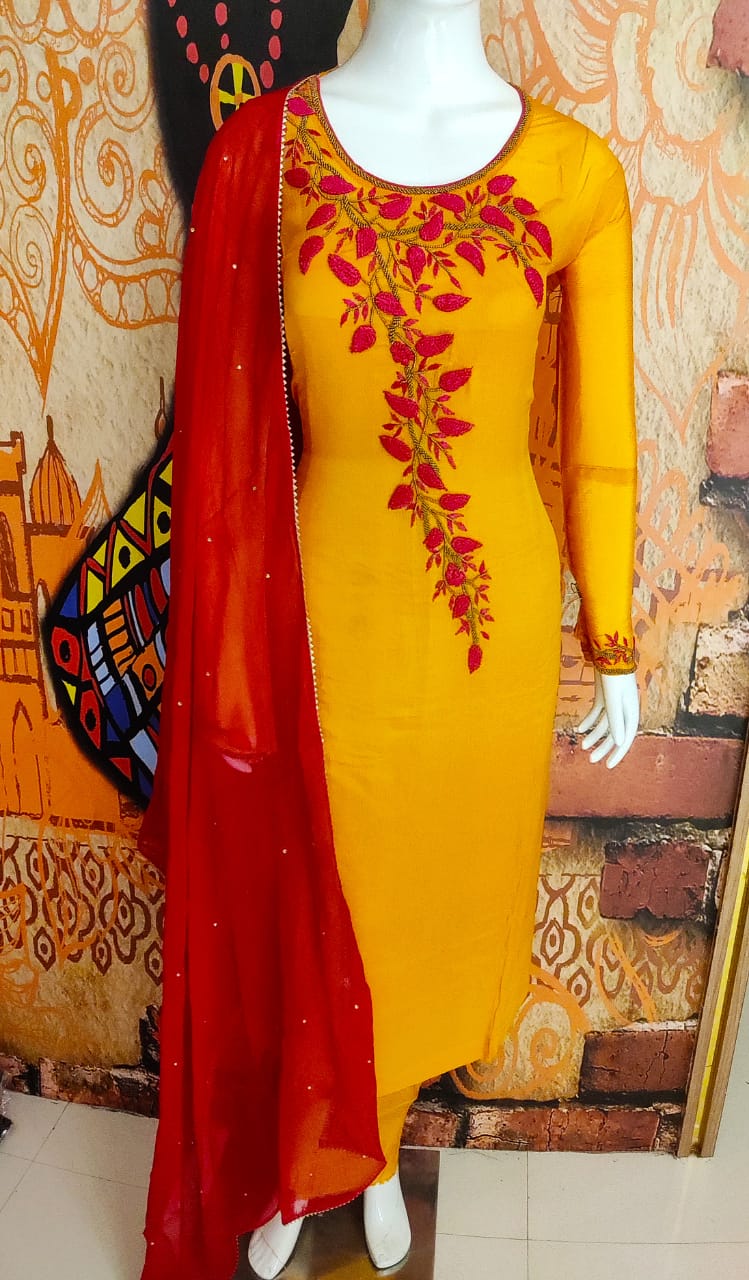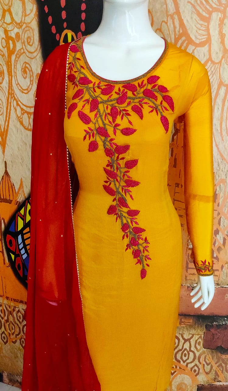 Sleeves work, Bust 48 aprx , length 45 aprx Bottom, santoon 3m aprx , Dupata full pure chiffon..