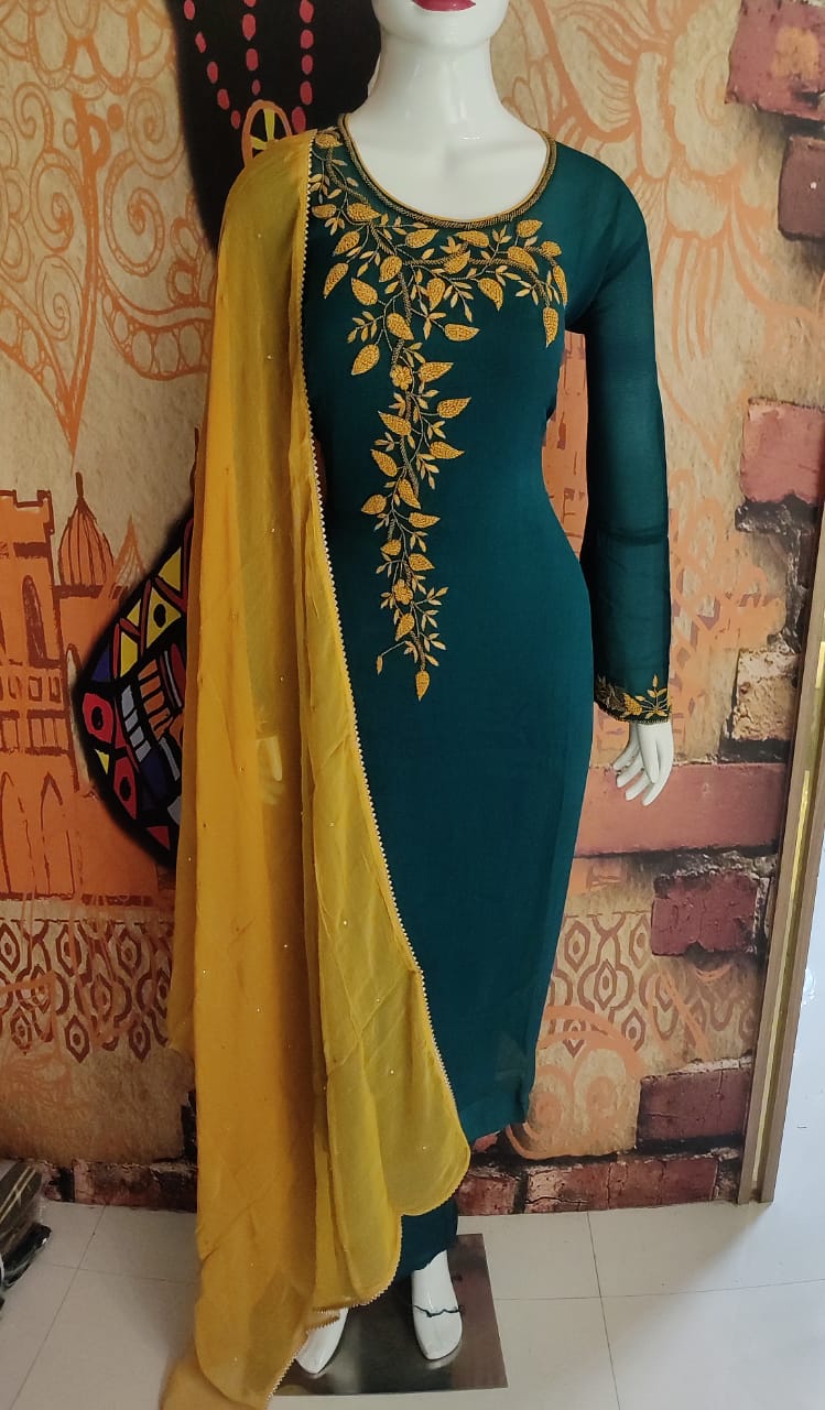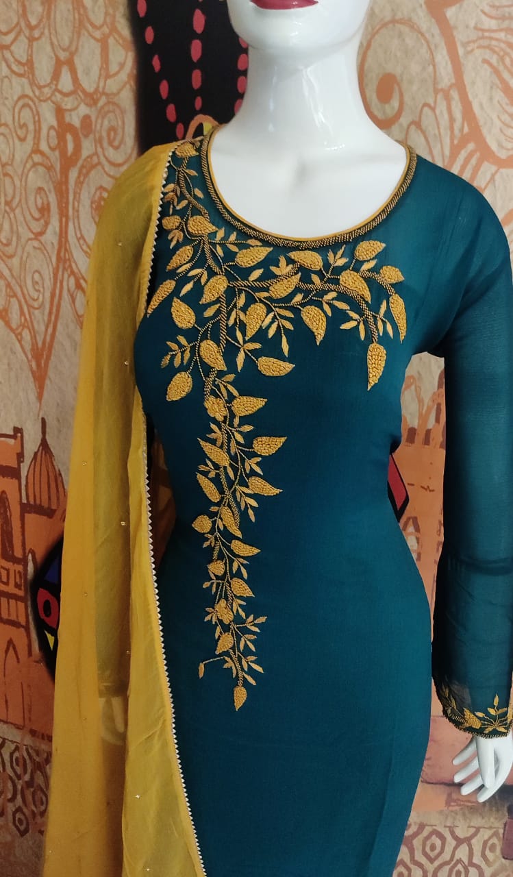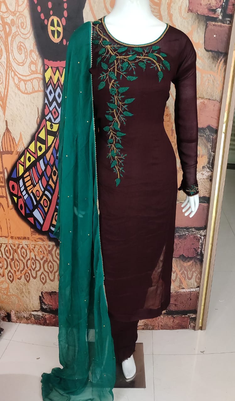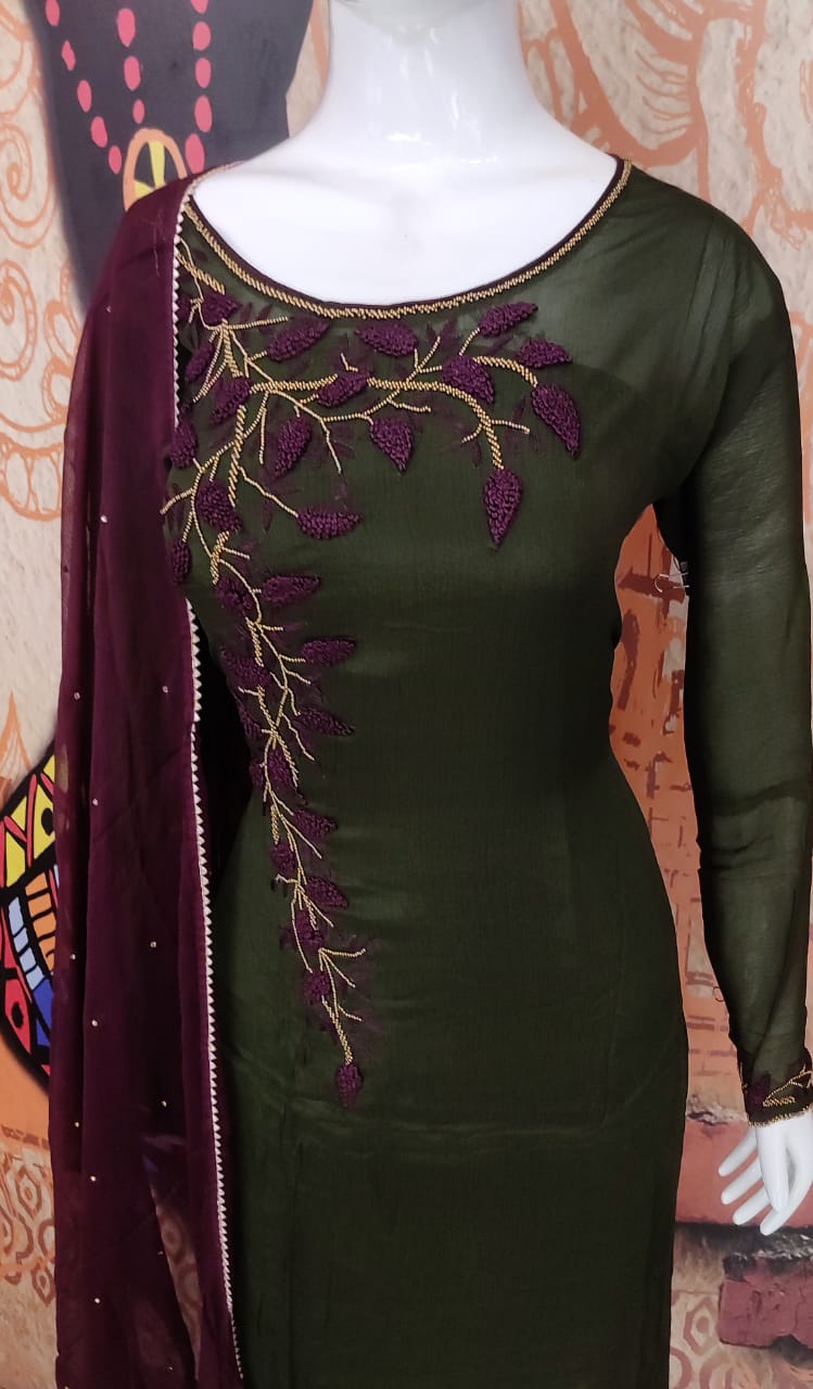 Sleeves work, Bust 48 aprx , length 45 aprx Bottom, santoon 3m aprx , Dupata full pure chiffon..